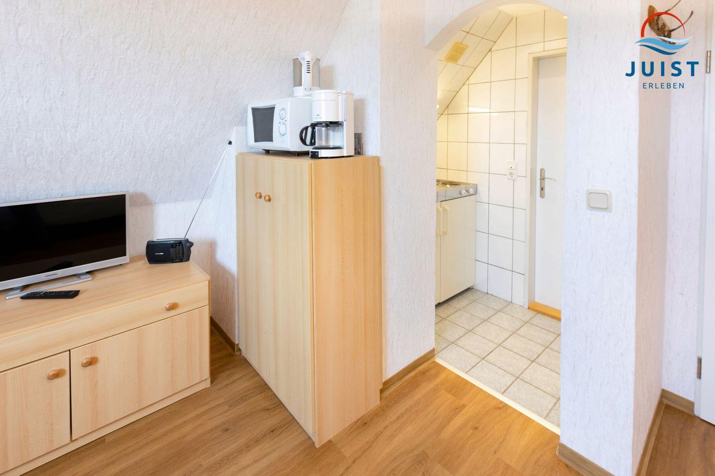 Damit Sie sich in Ihrem Urlaub auf Juist bequem selbst verpflegen können, verfügt die Küchenzeile u.a. über einen Herd, einen Kühlschrank und eine Mikrowelle sowie über eine Kaffeemaschine, einen Wasserkocher und einen Toaster.