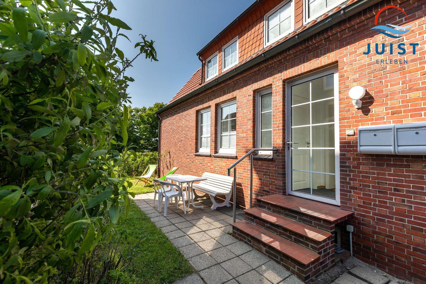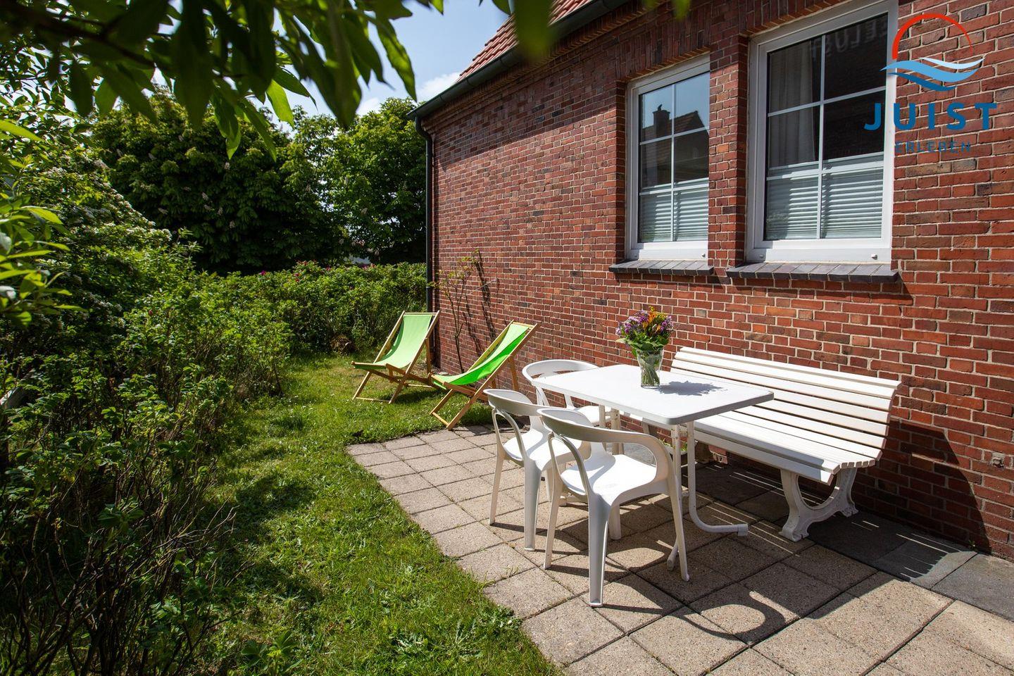 Genießen Sie entspannte Stunden auf der Terrasse – ausgestattet mit gemütlichen Sitzplätzen und einem Strandkorb, ideal für frische Nordseeluft und gute Gespräche.