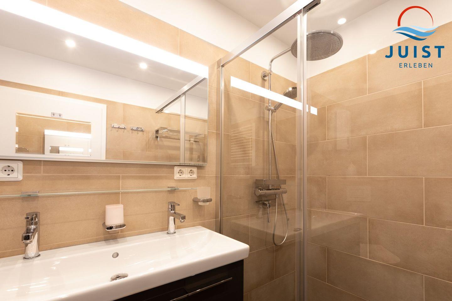 Das moderne Badezimmer verfügt über eine ebenerdiger Regendusche.