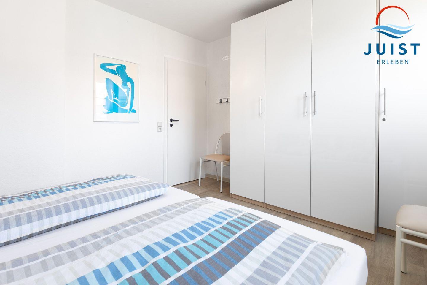 Ein Schlafzimmer ist mit einem Doppelbett und Kleiderschrank ausgestattet.