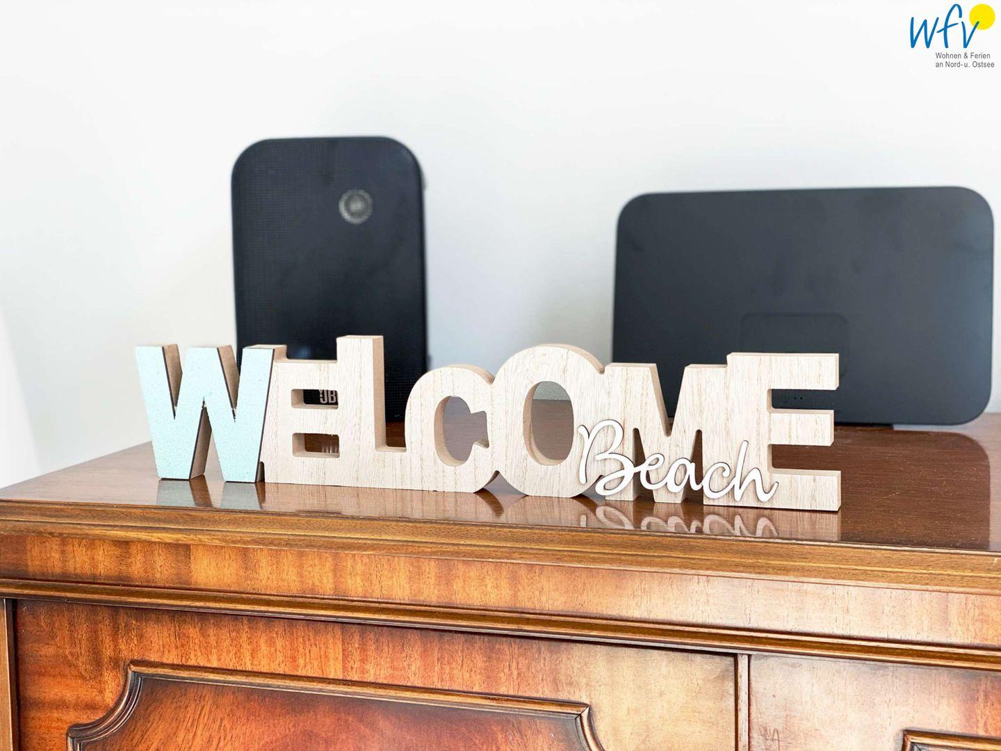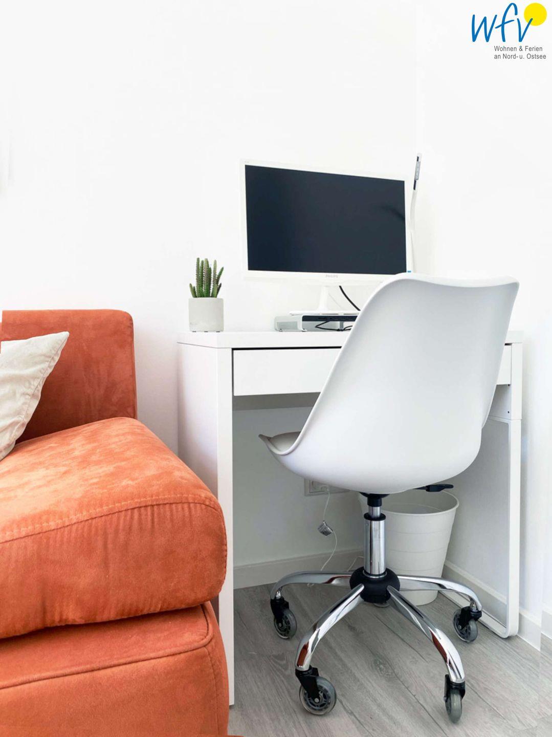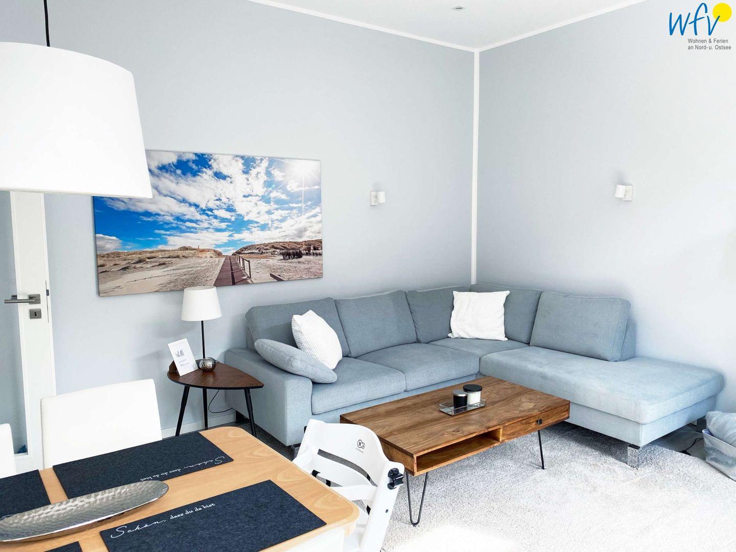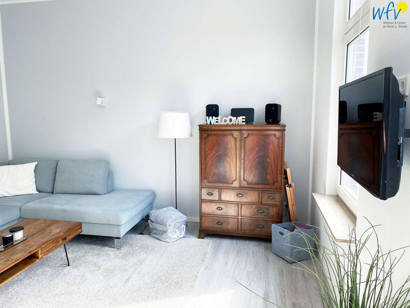 Ob nach dem Strandtag oder nach Feierabend - der Wohnraum mit bequemer Couch, TV (mit Fire TV Stick), HiFi-Anlage und freiem WLAN lädt zum ausgiebigen Relaxen ein! Hier können Sie entspannt einen guten Film schauen, Musik hören oder im Netz surfen.