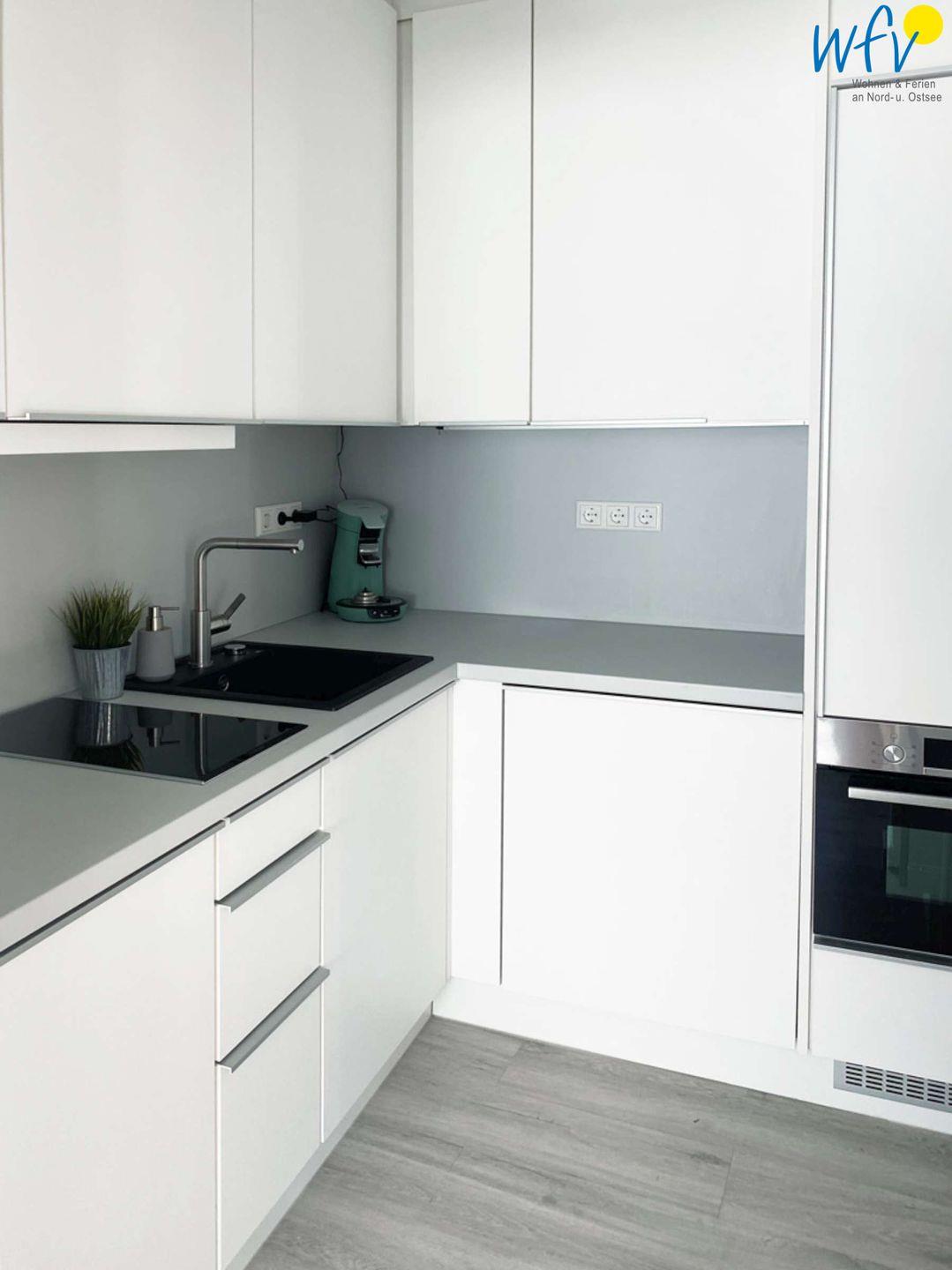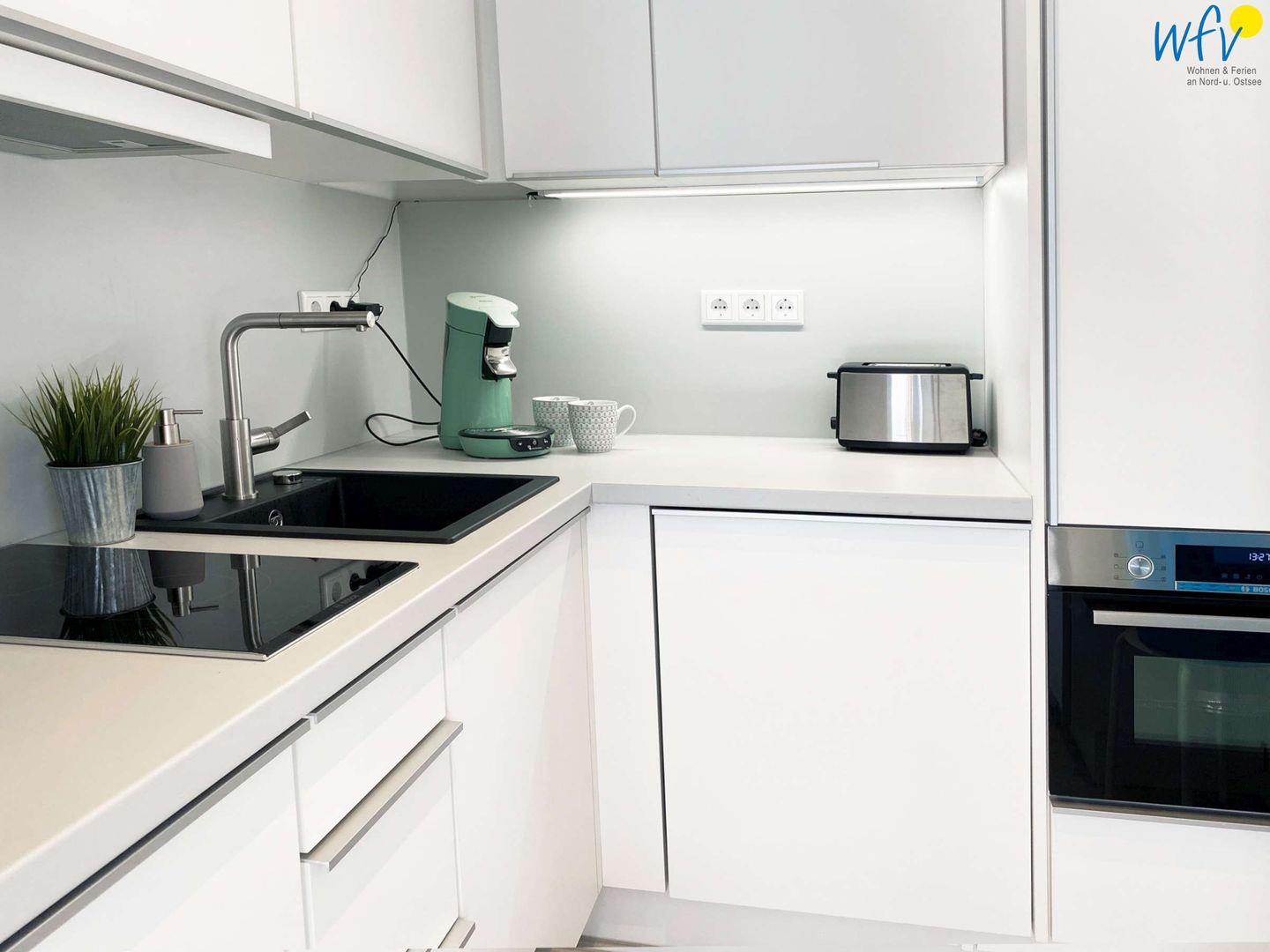 Warme Frühstücksbrötchen, den Arbeitssnack zwischendurch oder das gemütliche Familienessen können Sie ganz bequem in der modernen Einbauküche anrichten. Ausgestattet ist sie u.a. mit einem 2-Platten-Ceranherd, einem Backofen, einer Mikrowelle und einer Spülmaschine. Für die Kaffeeliebhaber gibt es eine Espressomaschine, für den Snack einen Sandwichmaker; auch Toaster, Wasserkocher, Mixer und Rührstab sind vorhanden. Einen Essplatz finden Sie im Wohnraum.