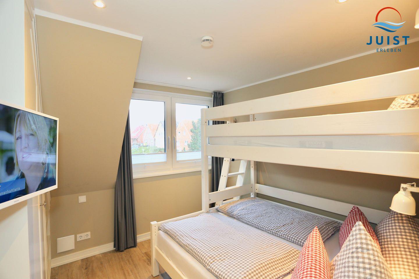 Das zweite Schlafzimmer ist mit einem Hochbett eingerichtet. Auf der unteren Ebene befinden sich 2 weitere Schlafmöglichkeiten.