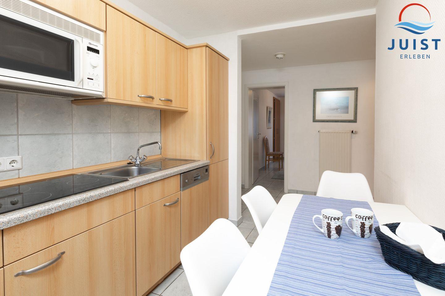 Die Küche mit Essbereich ist mit 4-Platten-Ceranfeld, Spülmaschine, Mikrowelle, Kühlschrank mit Gefrierschrank, Kaffeemaschine und Toaster ausgestattet.