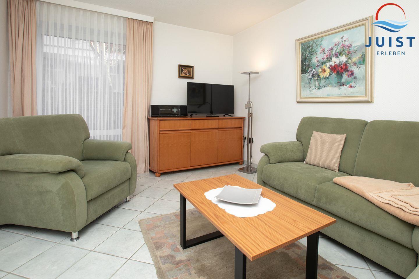 Die Wohnung verfügt über ein gemütliches Wohnzimmer mit Couchecke, TV und Radio.