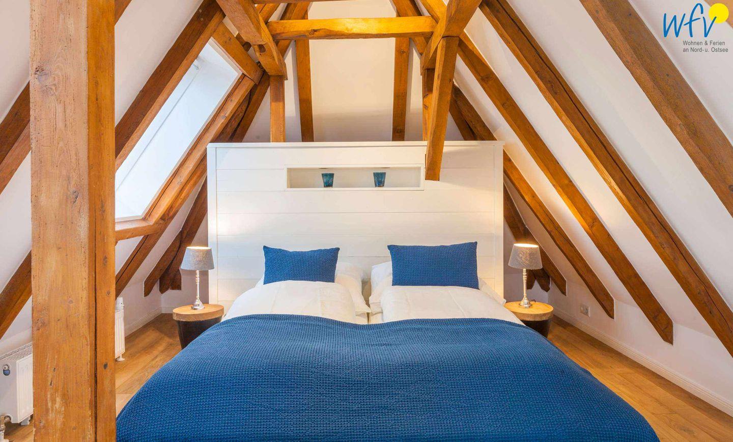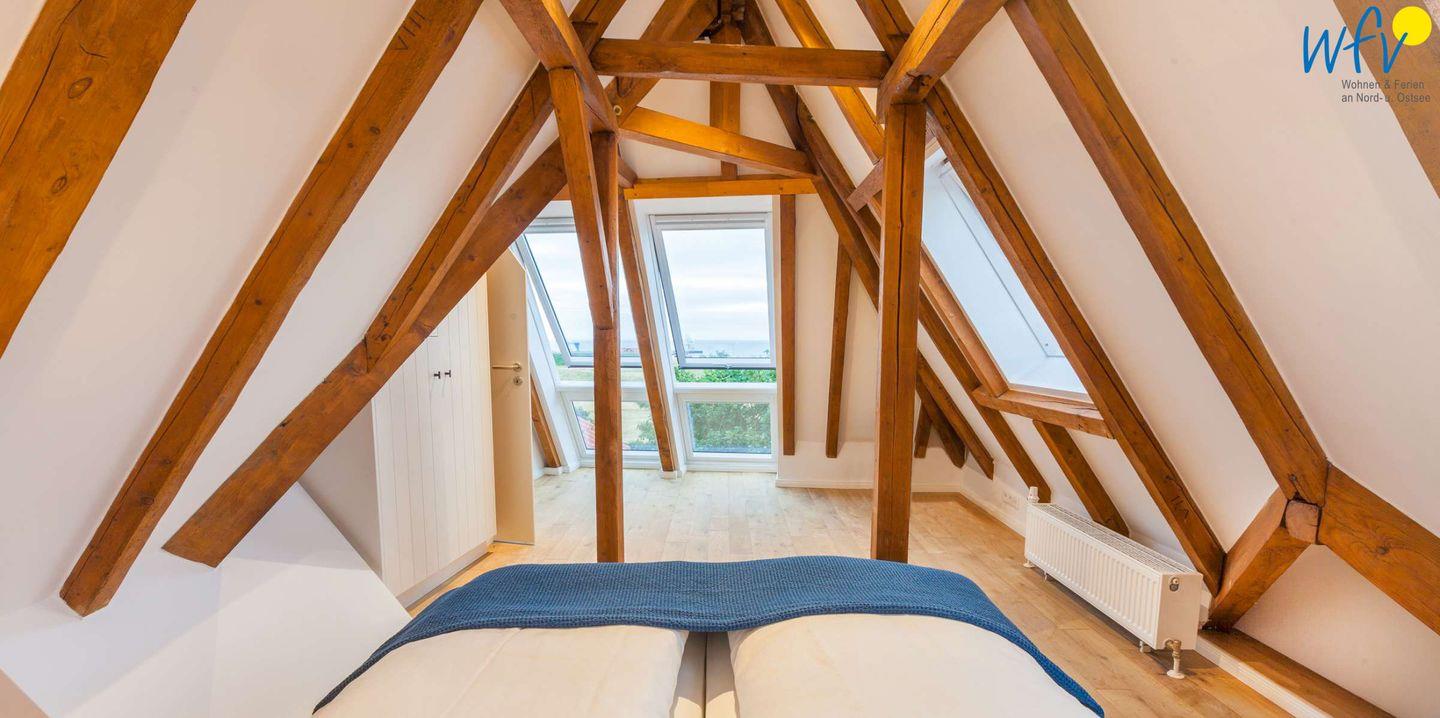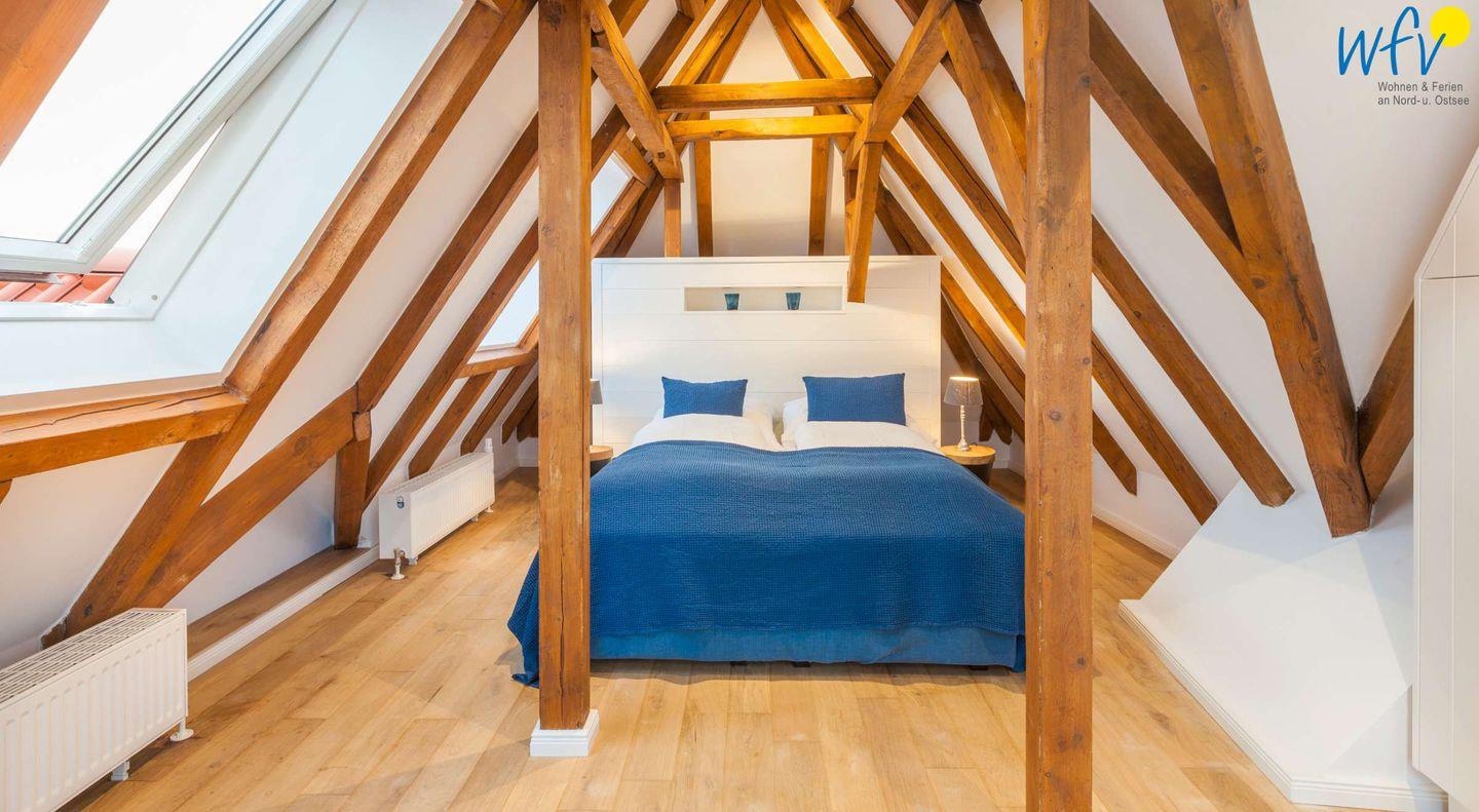 Auf der zweiten Etage der Ferienwohnung "Kleine Töwerliebe" auf Juist befindet sich das separate Schlafzimmer mit bequemem Doppelbett (180 x 200 cm). Freigelegte Holzbalken verleihen dem Raum eine sehr gemütliche Atmosphäre. Zudem erwartet Sie ein einzigartiger Ausblick auf Juists malerische Naturlandschaft!