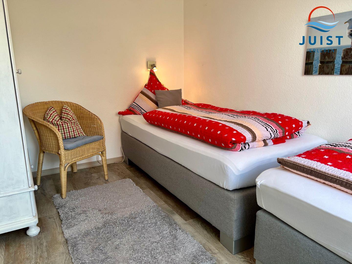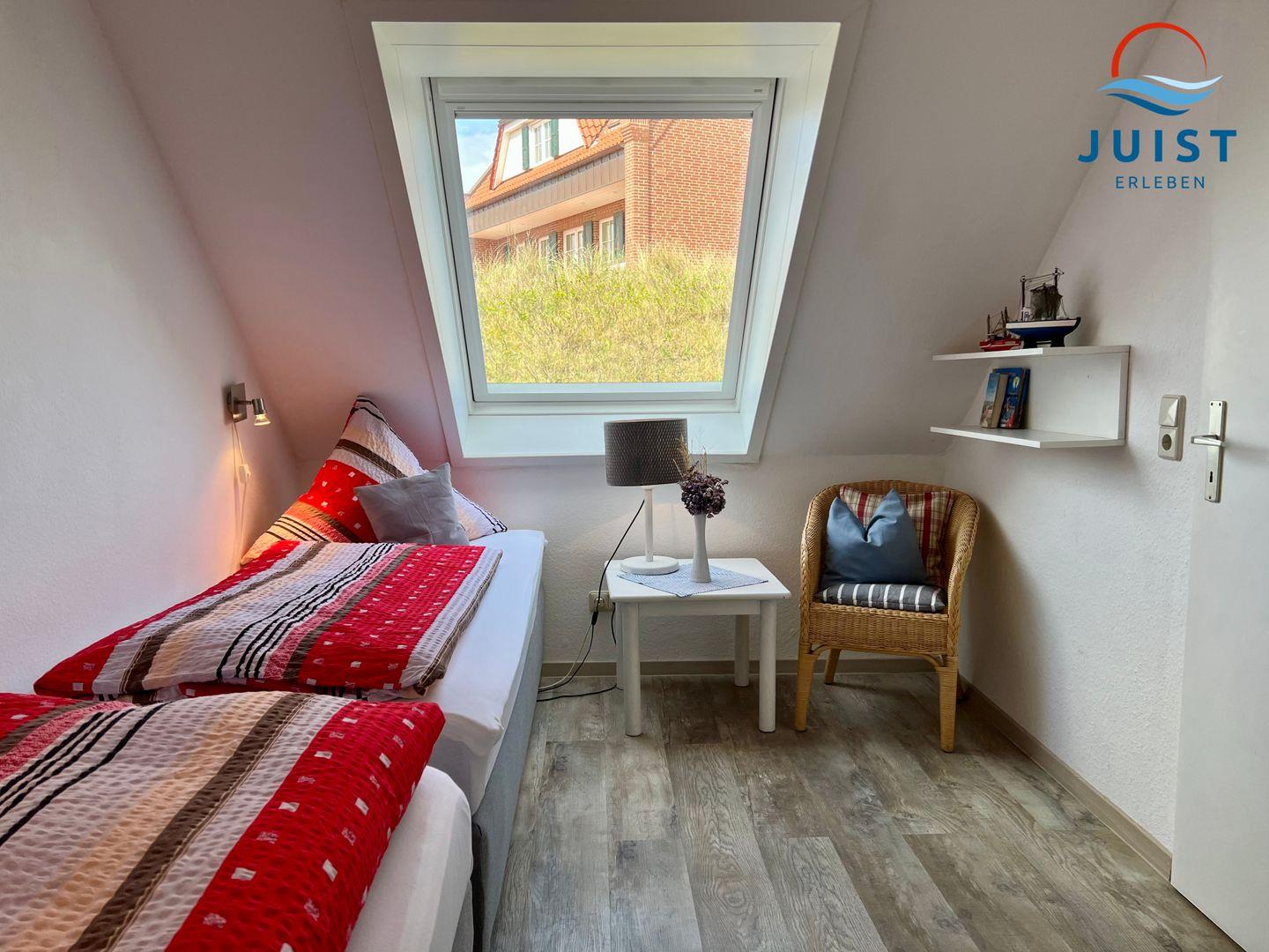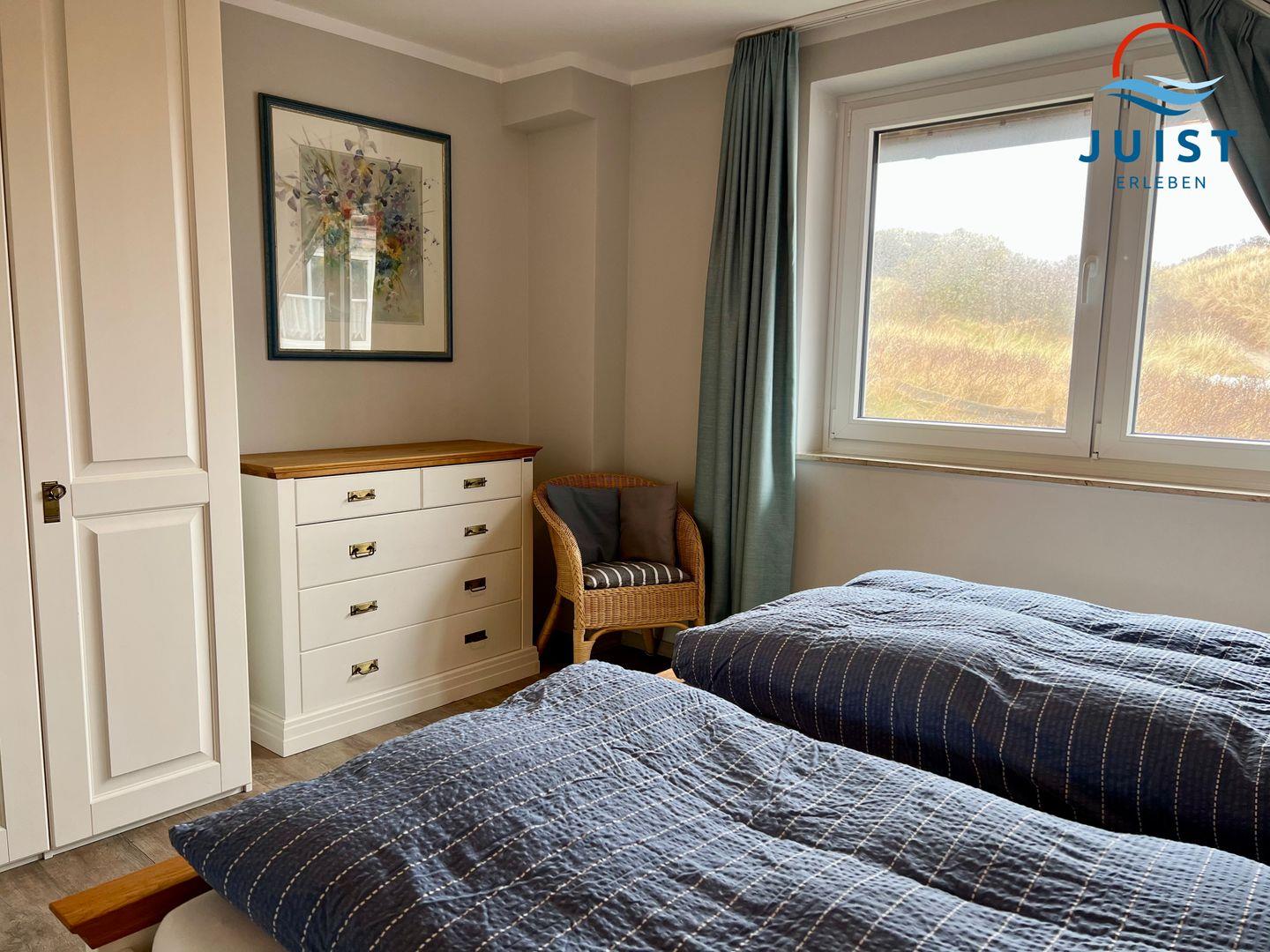 Das großzügige Doppelschlafzimmer ist mit einem Doppelbett und Kleiderschrank ausgestattet. Der Blick führt in die Dünenlandschaft. Das Zweibettzimmer verfügt über 2 Einzelbetten.