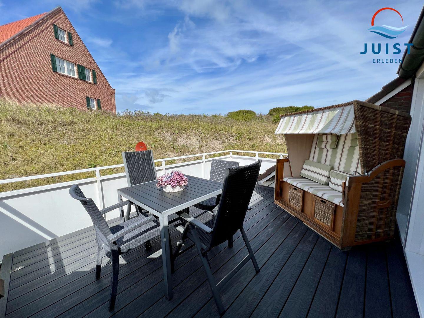 Auf ca. 60 m2 finden bis zu 4 Personen Platz. Auf dem großzügigem Balkon mit Strandkorb und Blick in die Dünen können sie sich gut erholen.