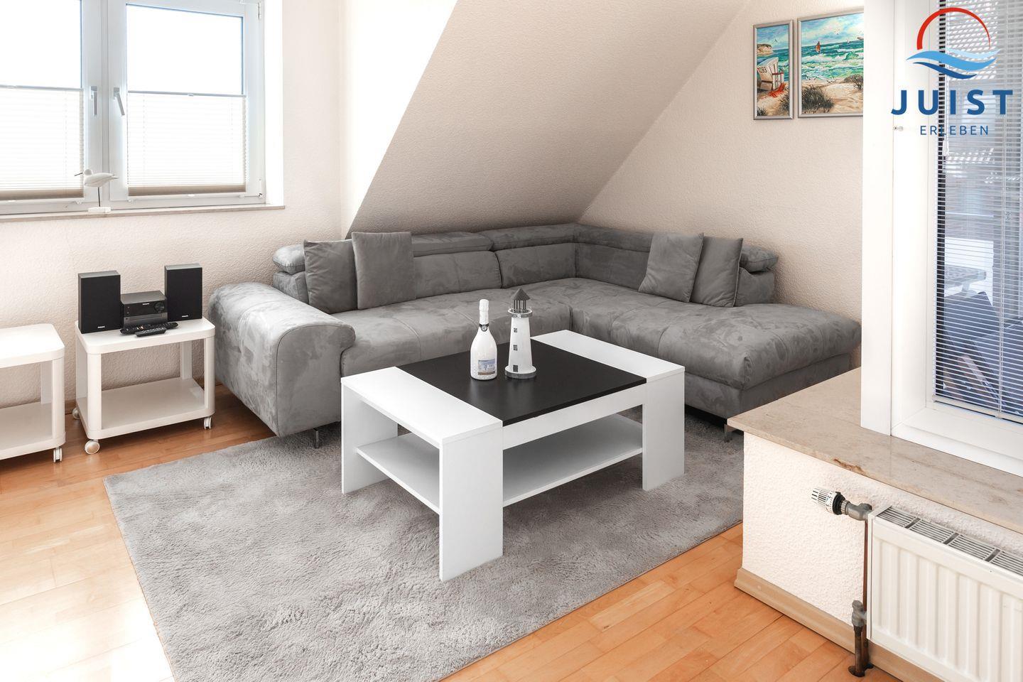 Es erwartet Sie im Wohnraum eine helle geräumige Atmosphäre mit einer bequemen Couchecke, Fernseher und Stereo Anlage.