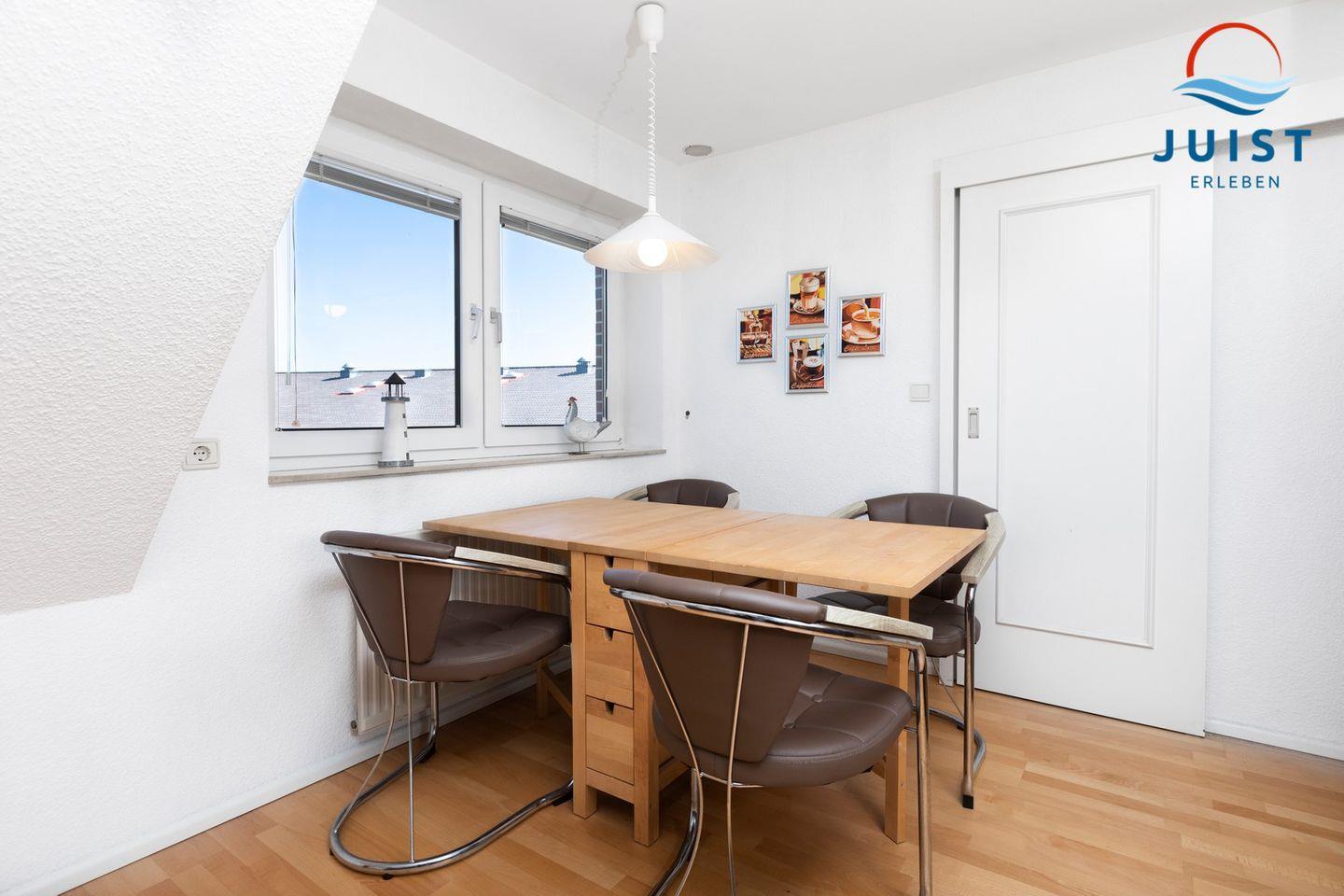 Die Küche gibt Ihnen die Möglichkeit, sich während Ihres Urlaubs auf Juist selbst zu verpflegen. Mit einem 4-Platten Ceran Herd, Kühlschrank, Gefrierschrank, Geschirrspülmaschine, Toaster, Eierkocher und Kaffeemaschine haben Sie alles, was Sie für die Zubereitung von Mahlzeiten benötigen.