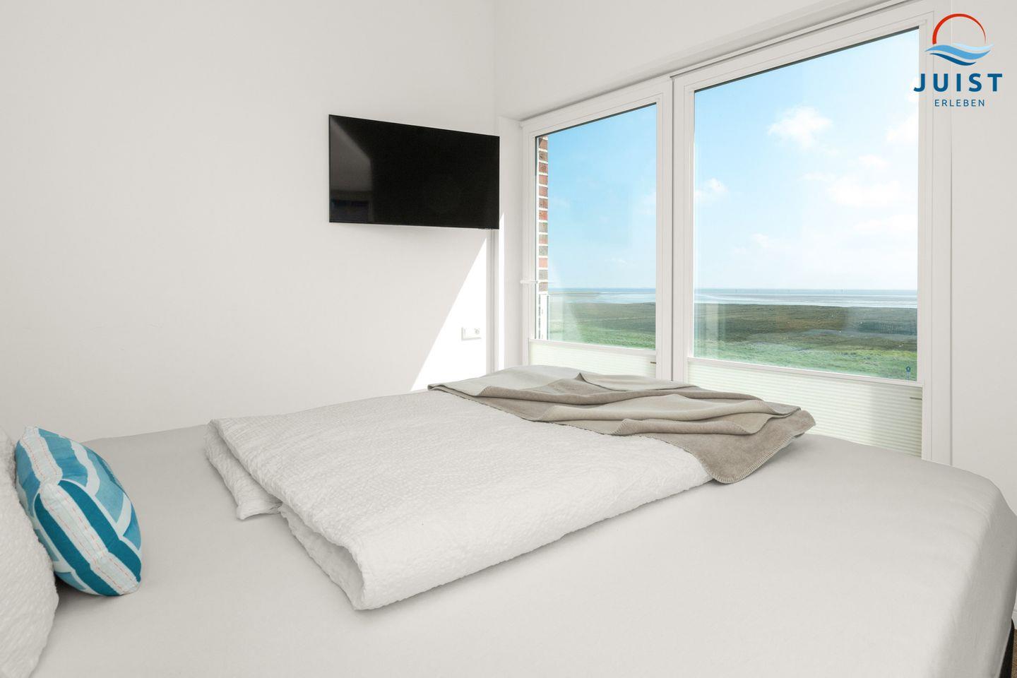 Von einem Schlafzimmer aus haben Sie einen direkte traumhaften Blick über die Salzwiesen und das Wattenmeer.