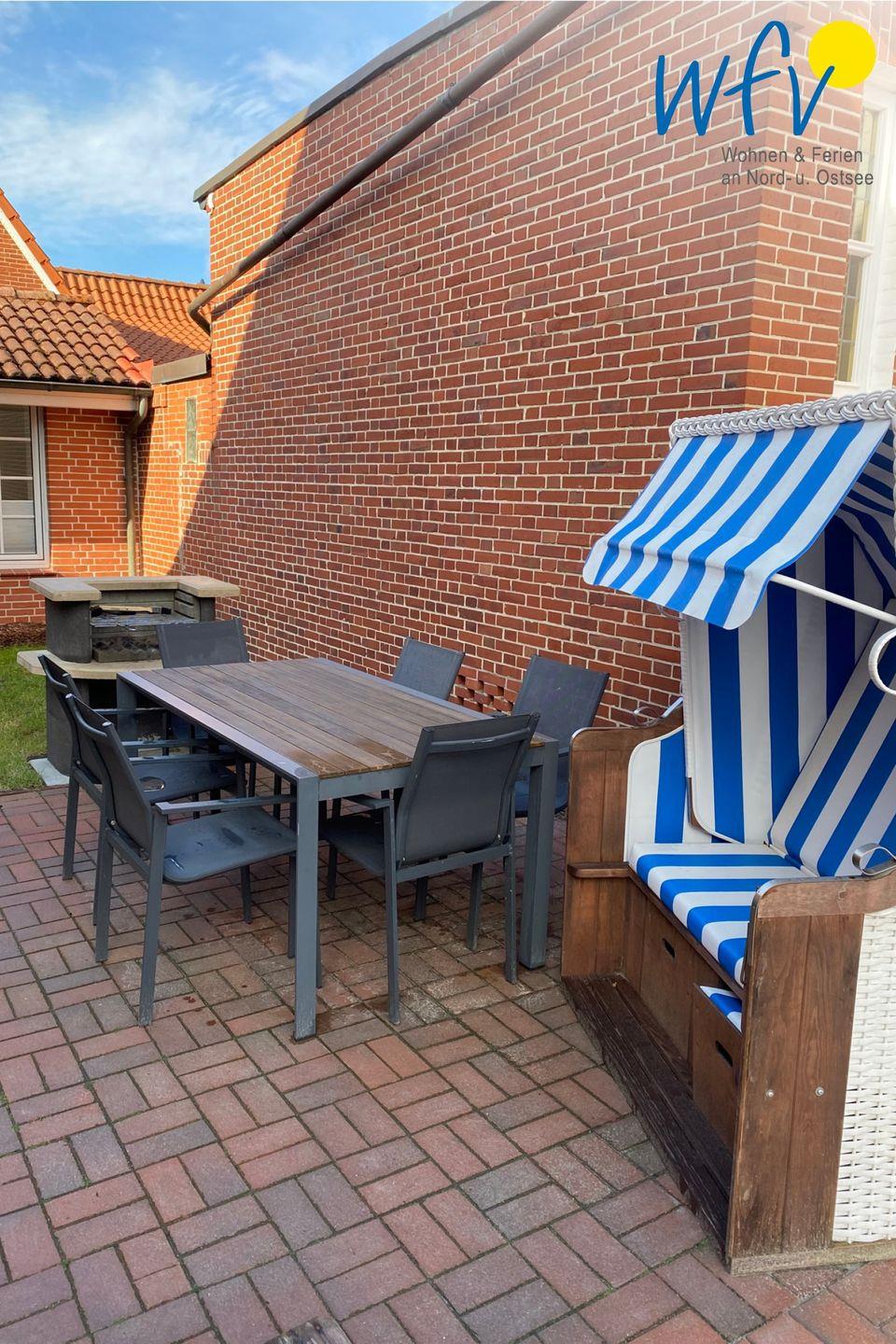 Von der Rückseite des Hauses gelangen Sie über eine Wendeltreppe in die helle und gut aufgeteilte Wohnung (OG + DG). Sie verfügt über einen großzügigen Wohn-/Essbereich, zwei separate Schlafzimmer und über ein Badezimmer plus Gäste-WC. Sonne und frische Nordseeluft genießen Sie auf dem Südbalkon sowie auf der Terrasse mit Strandkorb und Grillplatz im Untergeschoss.