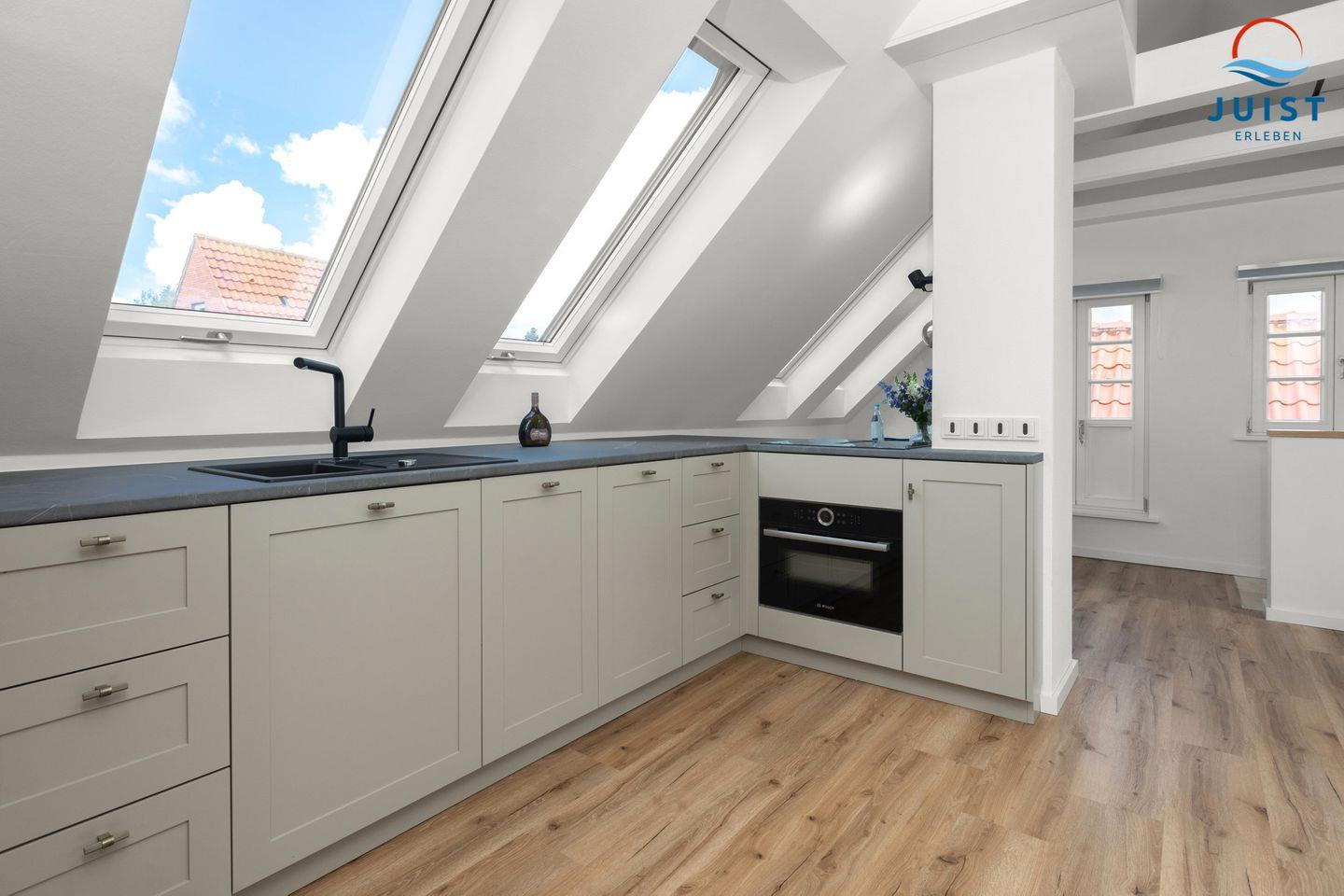 Die moderne und luxuriös ausgestattete Küche verfügt unter anderem über einen Induktionsherd sowie Backofen, Geschirrspüler, Kühlschrank, Kaffeemaschine,