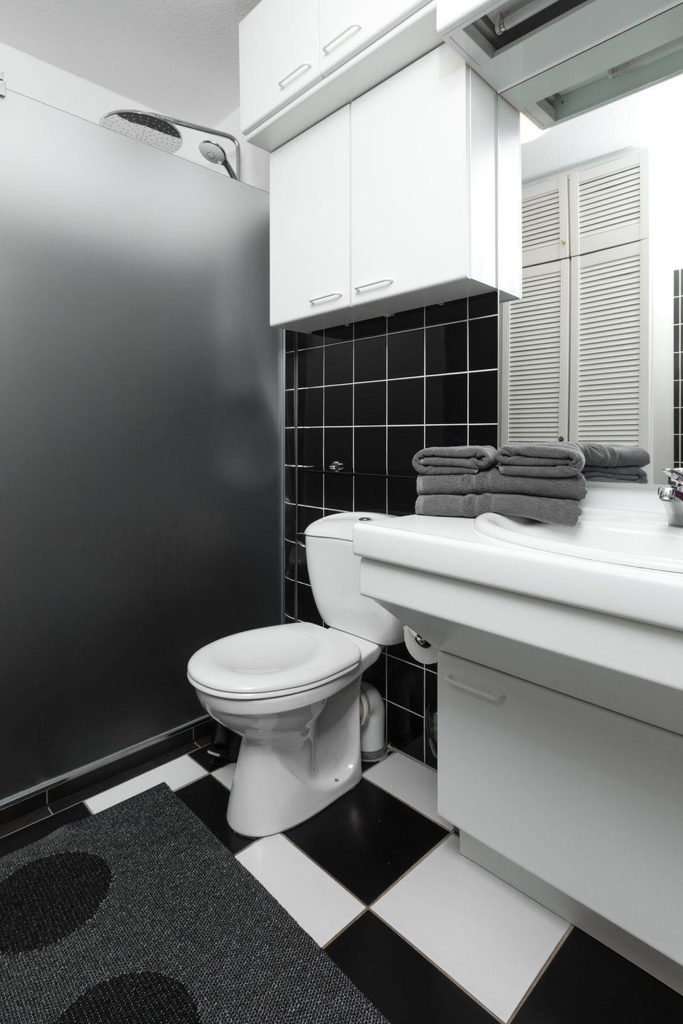 Das Badezimmer verfügt über eine moderne Regendusche, ein WC und ein Waschbecken. Pflegeprodukte werden gestellt, sodass Sie sich sofort wohlfühlen können.