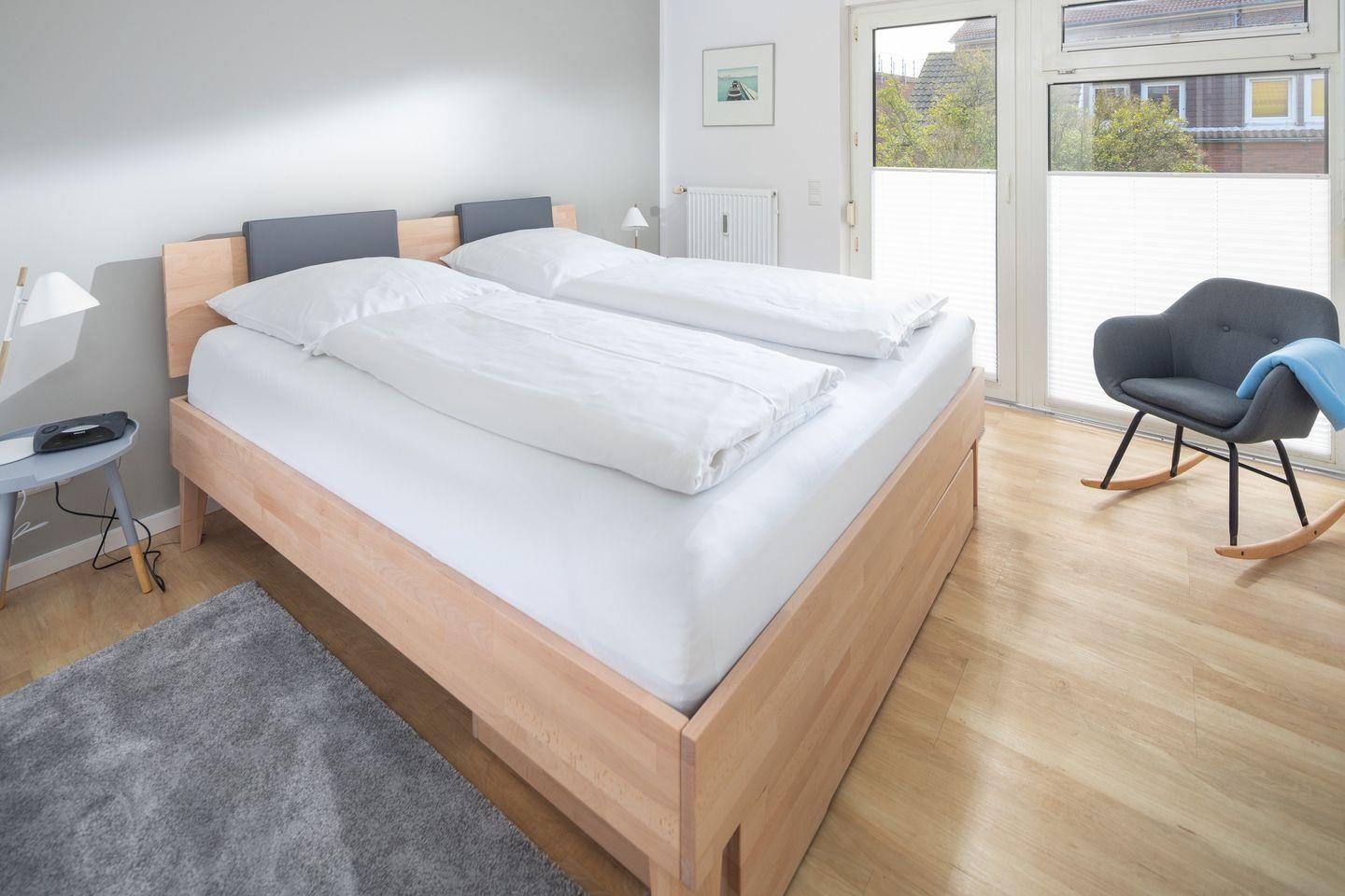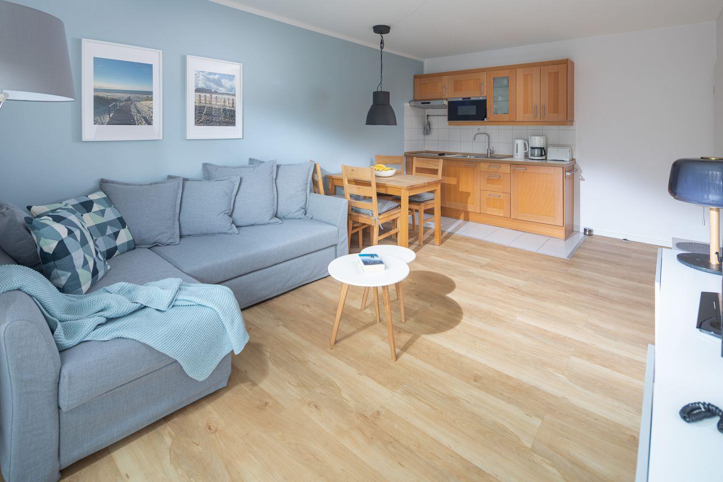 Die moderne Ferienwohnung begeistert durch ihre geschmackvolle Ausstattung. Sie verfügt über ein Schlafzimmer mit einem komfortablen Bett sowie eine Sofaecke im Wohnzimmer,die als zweite Schlafmöglichkeit dient. Der offene Wohn- und Essbereich ist der ideale Ort, um gemeinsame Mahlzeiten zu genießen oder einfach nur bei einem Glas Wein zu relaxen. Die Küche ist komplett ausgestattet und lässt keine Wünsche offen – vom Herd über die Spülmaschine bis hin zur Mikrowelle und Filterkaffeemaschine ist alles vorhanden, was Sie für die Zubereitung Ihrer Lieblingsgerichte benötigen.