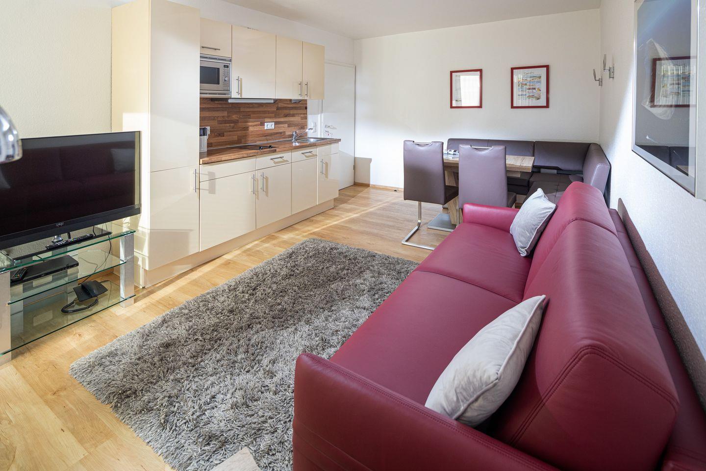 Die Wohnung befindet sich im ersten Stock des Appartement Haus Bracht und ist bequem mit dem Aufzug zu erreichen. Sie umfasst ein gemütliches Schlafzimmer mit Boxpringbett sowie ein Schlafsofa im Wohn-Essbereich. In der Küche finden Sie alle notwendigen Geräte wie Herd, Spülmaschine, Mikrowelle, Kühlschrank mit Gefrierfach, sowie eine Kaffeemaschine und einen Toaster. So sind Sie bestens für entspannte Kochabende ausgestattet! Der Essbereich mit einem großen Esstisch lädt zum gemeinsamen Essen und Verweilen ein.