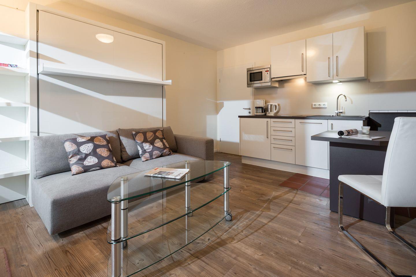 Das Appartement befindet sich im ersten Stock und ist bequem mit einem Aufzug zu erreichen. Das Appartement ist mit einem gemütlichen Sofa und einem Esstisch ausgestattet, an dem Sie entspannte Mahlzeiten genießen können. Eine voll ausgestattete Küche mit 2-Platten-Herd, Kühlschrank, Geschirrspüler, Mikrowelle und weiteren nützlichen Geräten sorgt dafür, dass Sie sich wie zuhause fühlen. Dazu gehören auch praktische Utensilien wie Toaster, Kaffeemaschine und Wasserkocher – alles, was Sie für einen gelungenen Aufenthalt benötigen.