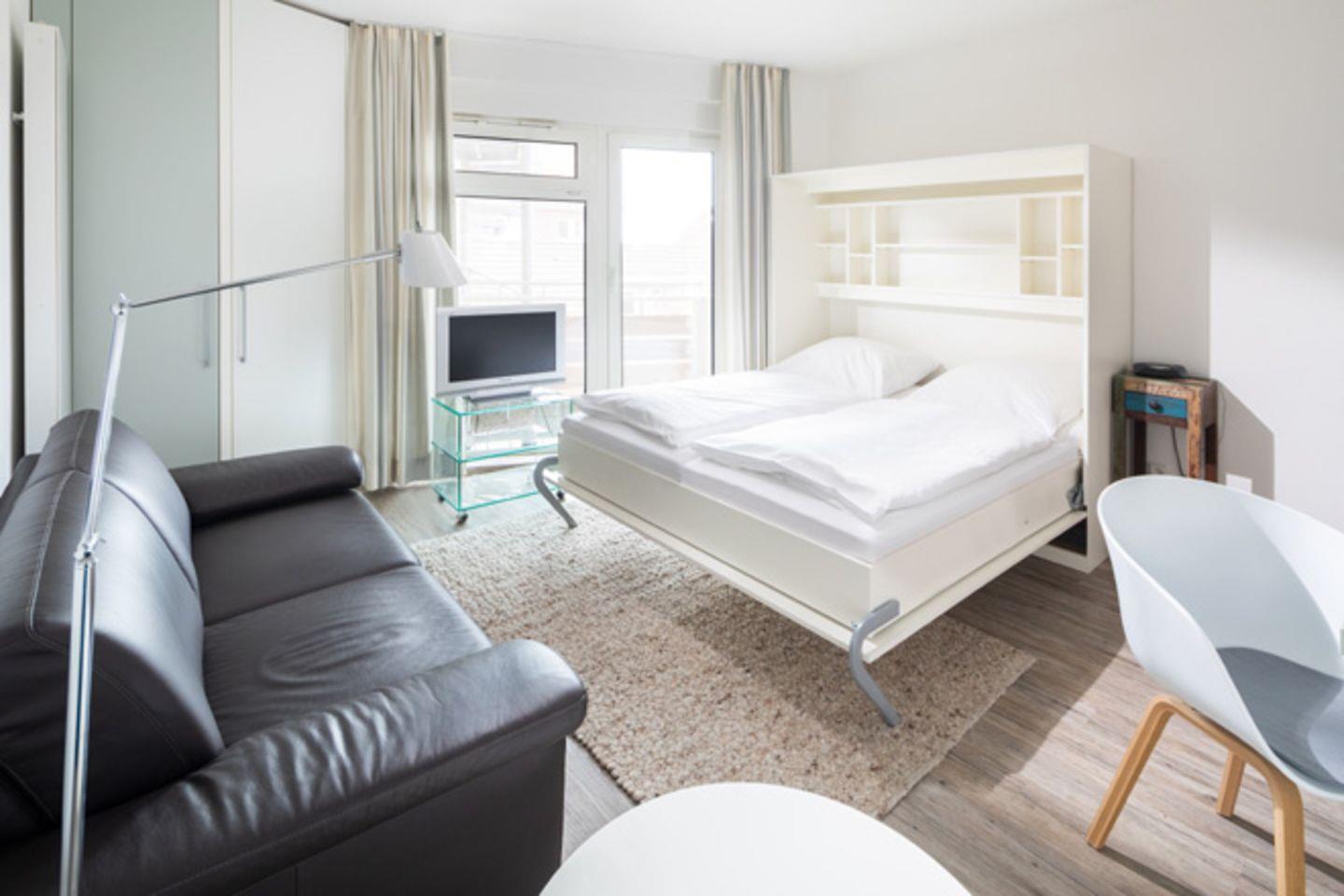 Mit einer Größe von 26 m² bietet die Kleine Brise Platz für bis zu zwei Personen. Die Wohnung befindet sich im 2. Stock und ist bequem mit dem Aufzug erreichbar. Es erwartet Sie eine offene Küche, die mit allem ausgestattet ist, was Sie für Ihren Aufenthalt benötigen. Vom Kühlschrank über einen 2-Platten-Herd bis hin zur Filterkaffeemaschine und Küchenutensilien – hier bleiben keine Wünsche offen. Der Essbereich und die Sofaecke laden dazu ein, gemütliche Stunden gemeinsam zu verbringen.