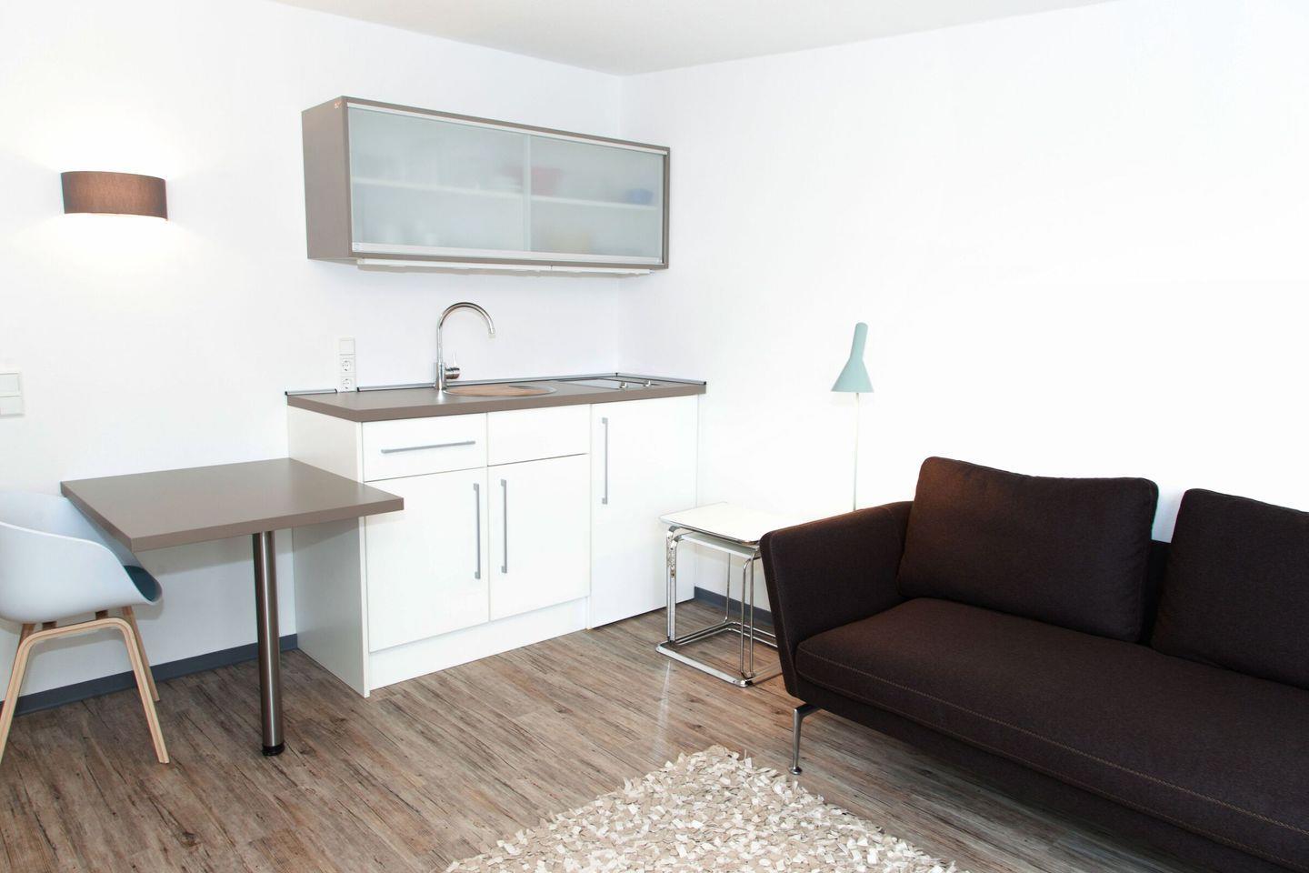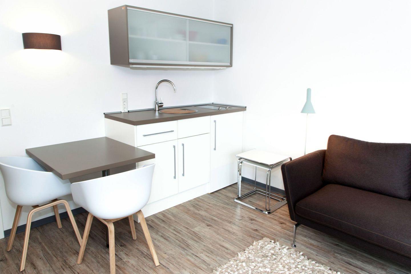 Mit einer Größe von 26 m² bietet die Kleine Wolke Platz für bis zu zwei Personen. Die Wohnung befindet sich im 3. Stock und ist bequem mit dem Aufzug erreichbar. Es erwartet Sie eine offene Küche, die mit allem ausgestattet ist, was Sie für Ihren Aufenthalt benötigen. Vom Kühlschrank über einen 2-Platten-Herd bis hin zur Kaffeemaschine und Küchenutensilien – hier bleiben keine Wünsche offen. Der Essbereich und die Sofaecke laden dazu ein, gemütliche Stunden gemeinsam zu verbringen.