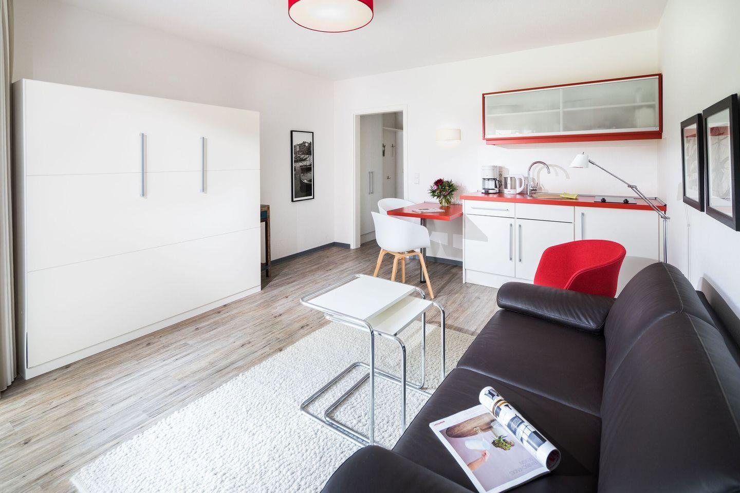 Die Wohnung verfügt über einen Wohn- und Schlafbereich mit einem ausklappbaren Schrankbett. Hier kann tagsüber das Bett hochgeklappt werden, so dass man genug Platz zum verweilen hat. Die Küche ist ausgestattet mit einem 2-Platten-Herd, Kühlschrank, Toaster, Wasserkocher und einer Filterkaffeemaschine.