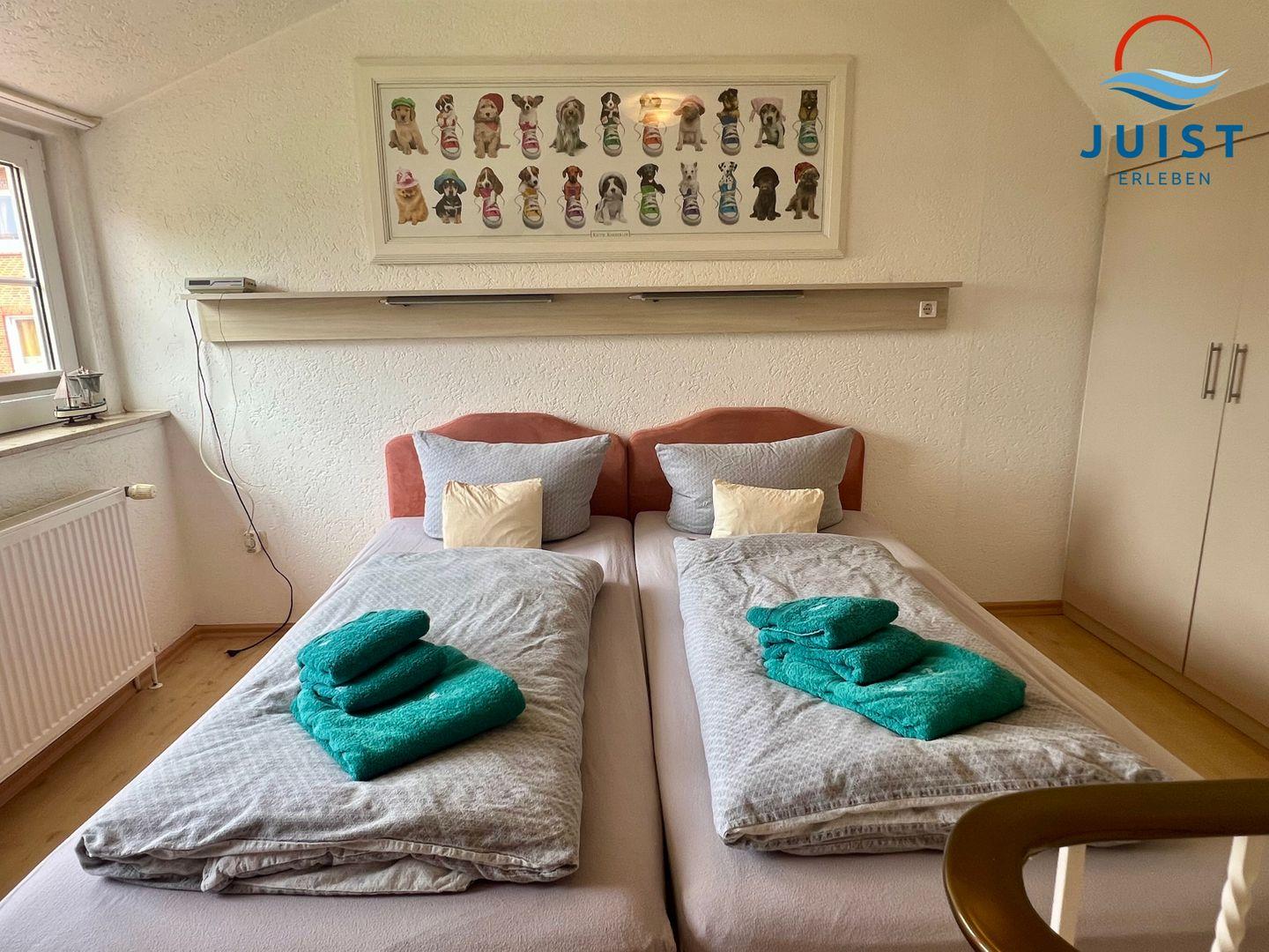 Über eine schmale Treppe gelangen Sie ins offene Obergeschoss, wo sich das Schlafzimmer mit komfortablem Doppelbett viel Staubmöglichkeiten und einem Wattenmeerausblick befindet – ein ruhiger Ort zum Träumen und Entspannen.