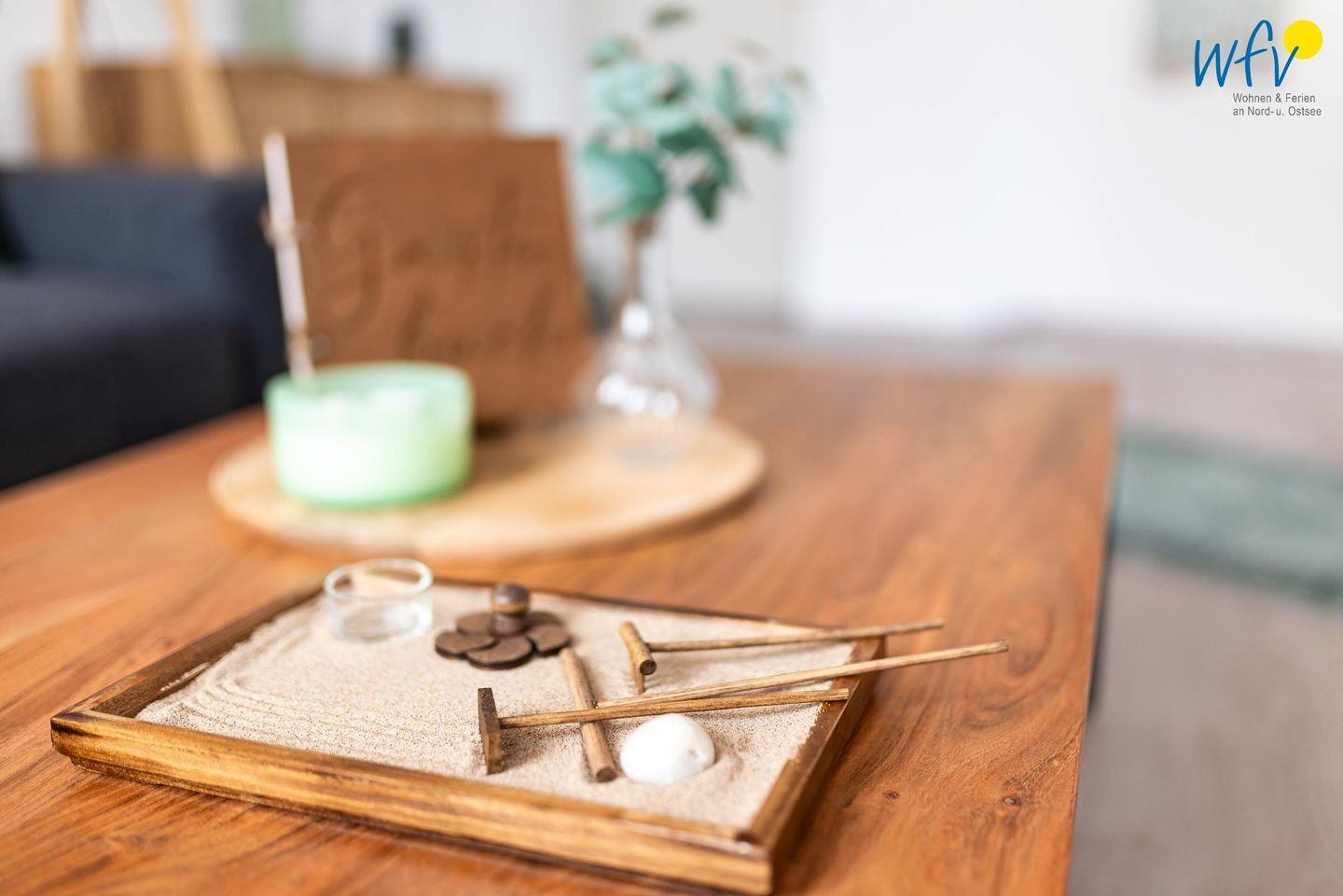 Bereits bei der Ankunft empfängt Sie schönste Urlaubsstimmung: Der helle Wohnraum mit hochwertiger Einrichtung in harmonischer Farbgestaltung bietet Platz zum gemütlichen Beisammensein und zum Ausspannen. Nach dem Strandtag oder der Fahrradtour lädt die Couch mit großem TV zum Fernsehen. Oder Sie lesen entspannt die Urlaubslektüre. Zum Surfen vom Smartphone aus empfangen Sie kostenlos freies WLAN.