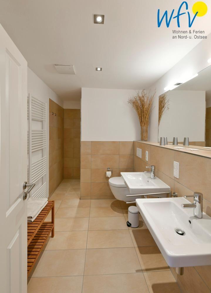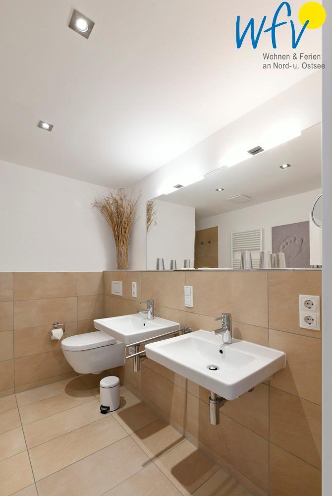 In dem modernen Badezimmer der Ferienwohnung „Dünenmulde“ sorgt eine stilvolle Einrichtung mit Regendusche, zwei Waschbecken und Handtuchheizung für eine verwöhnende Wohlfühlatmosphäre.
