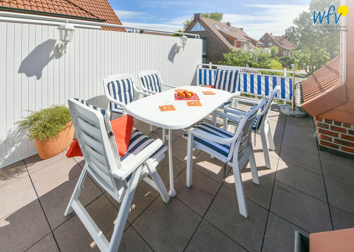 Entspannte Stunden an der frischen Nordseeluft garantiert Ihnen die sonnige Dachterrasse der Ferienwohnung „Schaefer“. Hier gemeinsam zusammenzusitzen, in Ruhe ein gutes Buch zu lesen oder einfach die Seele baumeln zu lassen ist pure Erholung in Ihrem Juist-Urlaub!