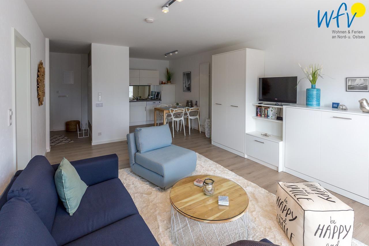 Das separate Schlafzimmer der Ferienwohnung auf Juist ist mit einem Doppelbett und einem großzügigen Kleiderschrank ausgestattet. Eine komfortable Einrichtung mit Couchecke, Schrankwand und Fernseher sorgt im Wohnraum für Gemütlichkeit.