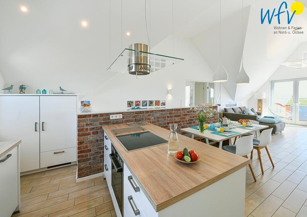 An den Wohnbereich grenzt eine offene Einbauküche mit Kochinsel an. Ihre komfortable Ausstattung (u.a. mit Induktionsherd, Backofen, Spülmaschine, Kaffeemaschine, Espressokocher und Wasserkocher) ermöglicht Ihnen eine bequeme Selbstverpflegung. Ein großer Esstisch bietet Platz für gemeinsame Mahlzeiten mit der ganzen Familie.