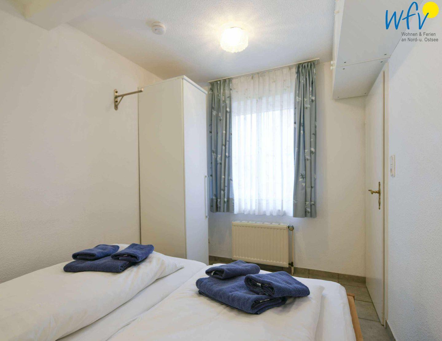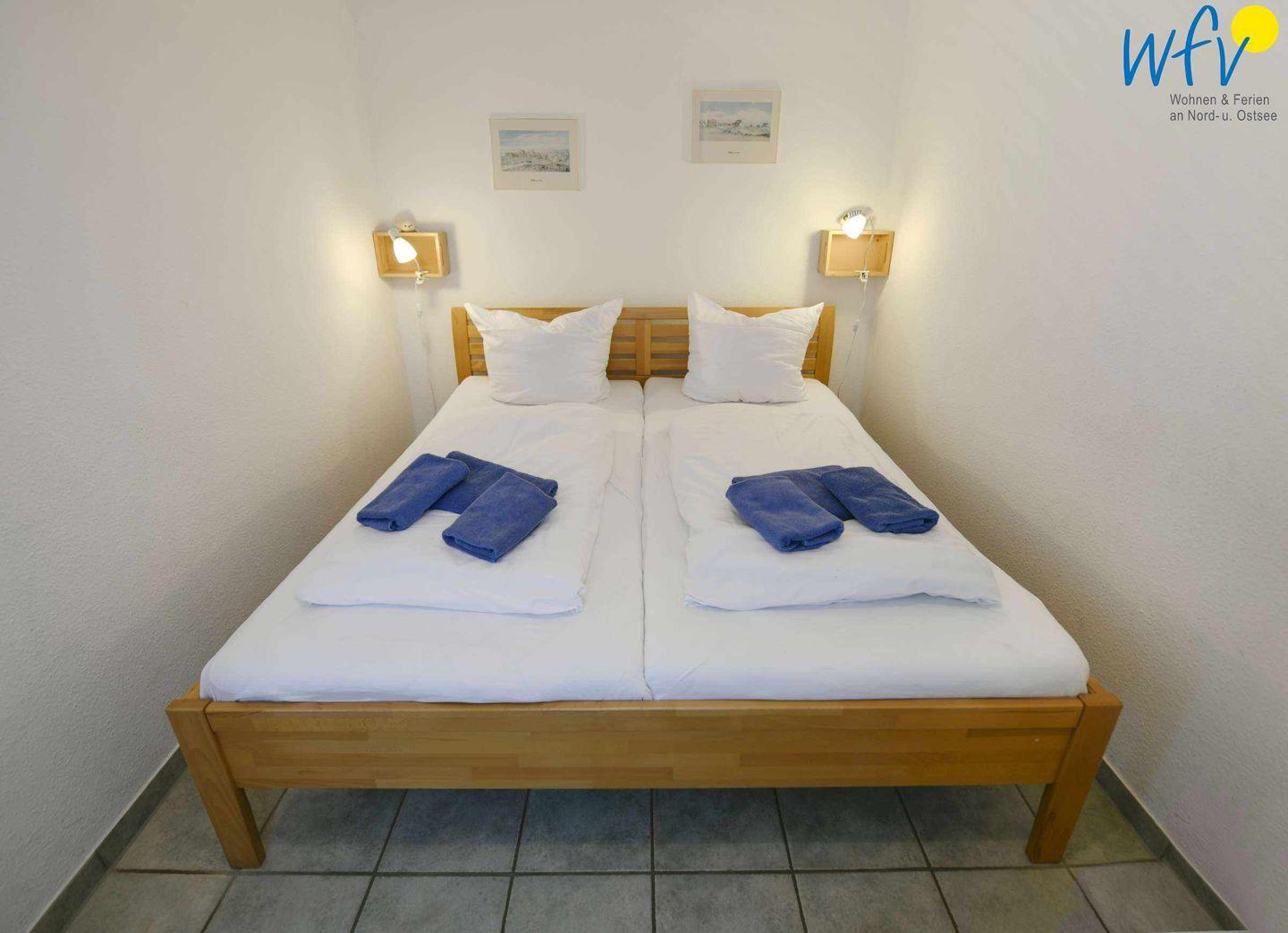 In dem separaten Schlafzimmer befinden sich ein Doppelbett und ein Kleiderschrank.