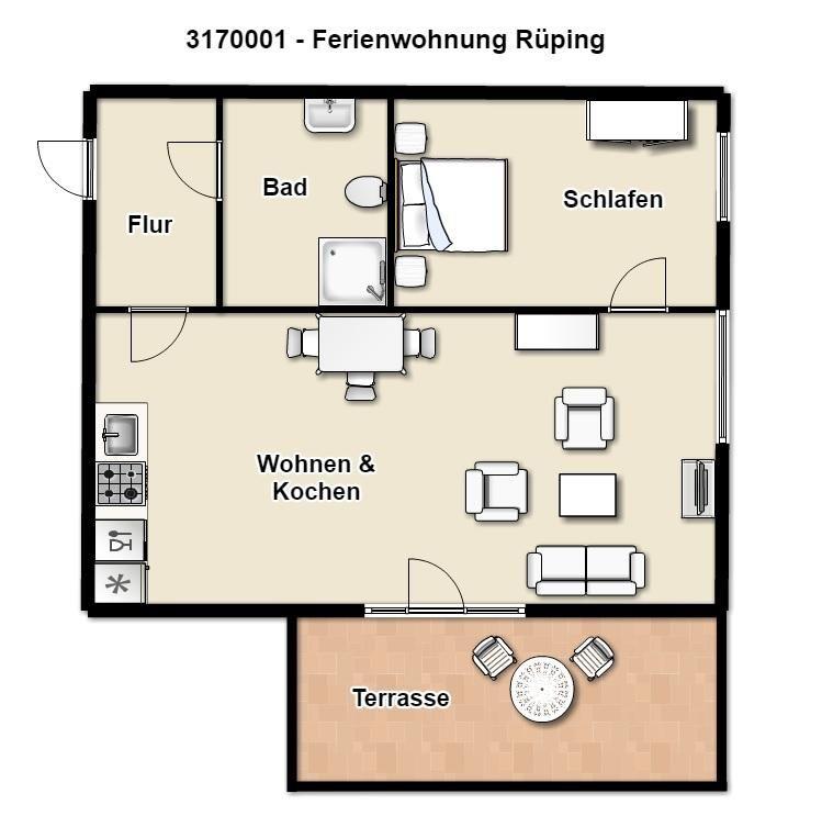 In dem hellen Wohnraum erwartet Sie eine gemütliche Couchecke, in der Ihnen ein TV (Kabel-TV), ein DVD-Player und ein Radio zur Verfügung stehen.