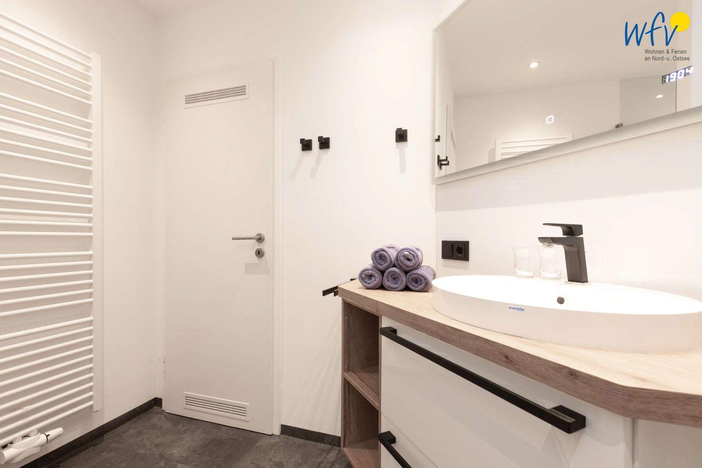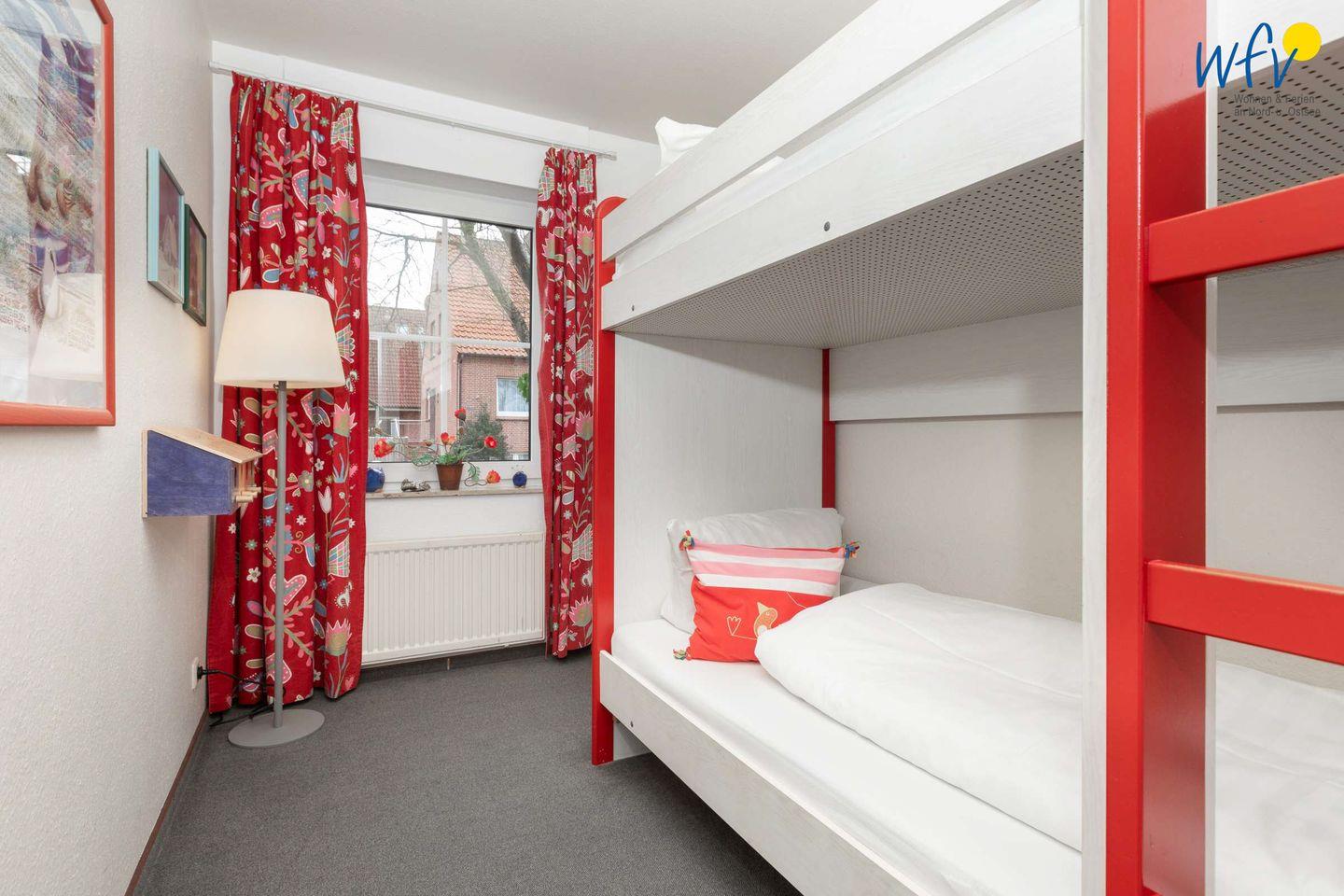 In dem separaten Elternschlafzimmer befindet sich ein bequemes Boxspringbett und ein geräumiger Kleiderschrank. Das zweite separate Schlafzimmer ist mit einem Etagenbett und einem Kleiderschrank ausgestattet und bietet zwei Kindern Platz. Ein Reisekinderbett und ein Hochstuhl gehören zur festen Ausstattung der Ferienwohnung.