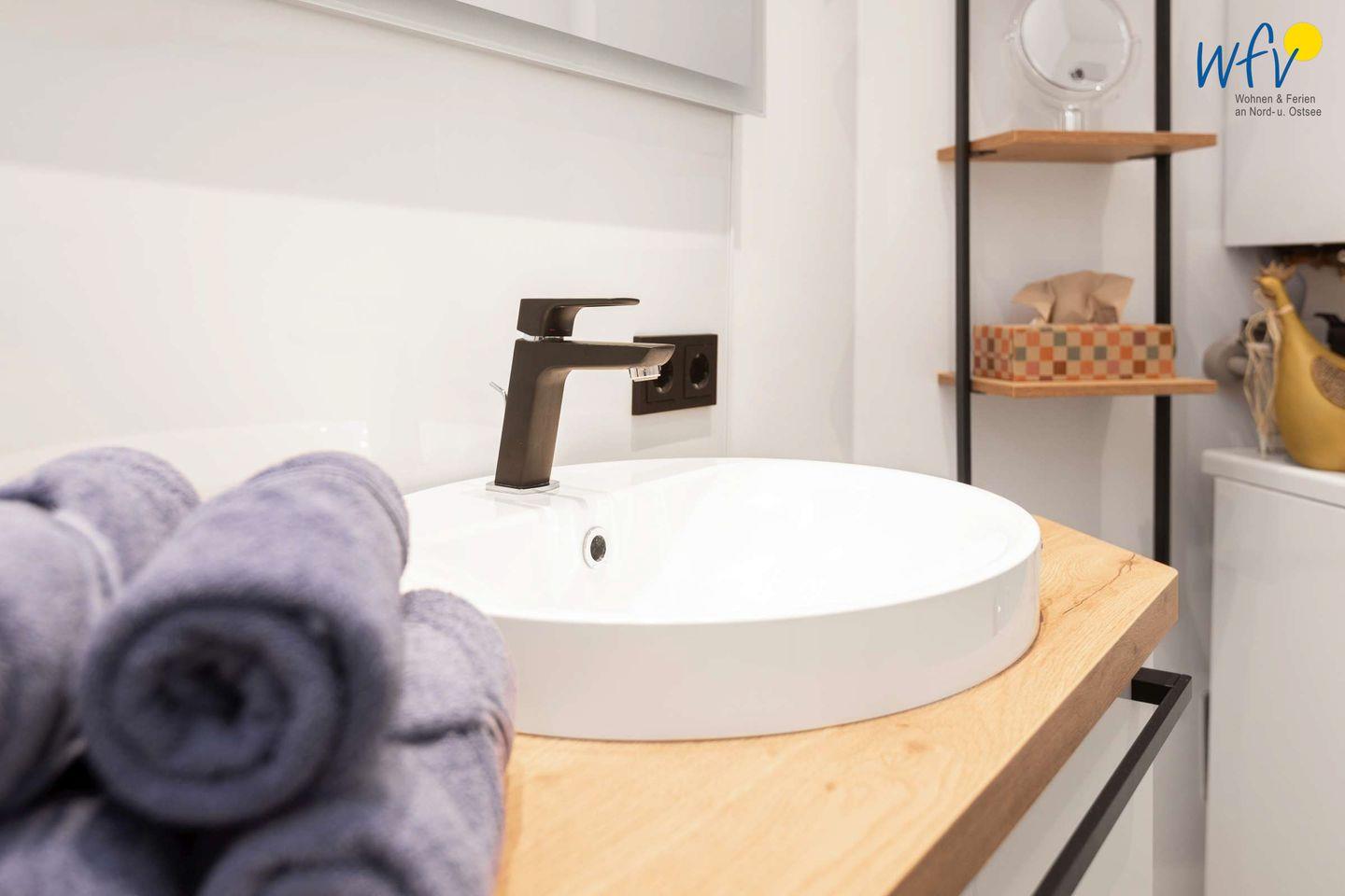 Für eine angenehme Selbstverpflegung in Ihrem Urlaub auf Juist verfügt die Küche u.a. über einen Herd mit Induktionskochfeld, einen Kühlschrank mit Gefrierfach und einen Backofen sowie über eine Kaffeemaschine, einen Wasserkocher und eine Mikrowelle.