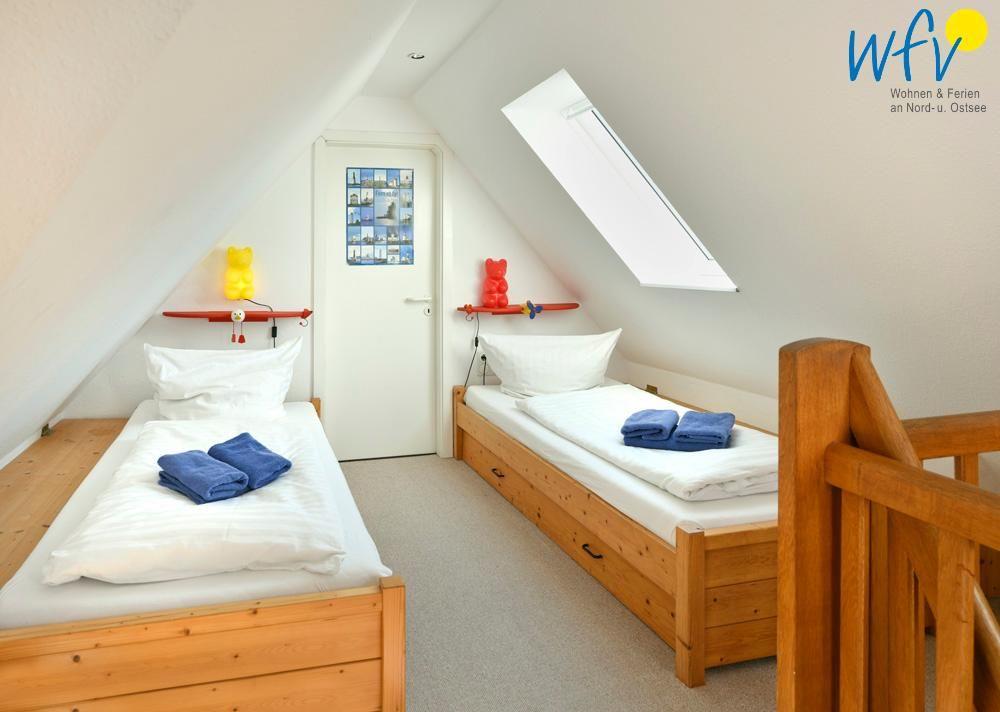 Zwei separate Schlafzimmer sowie ein Badezimmer plus Gäste-WC bieten Ihnen angenehme Ausweichmöglichkeiten. Das eine Schlafzimmer befindet sich in der unteren Etage und verfügt über ein Doppelbett und ein Holzkinderbett. Das Schlafzimmer in der oberen Etage ist mit zwei Einzelbetten eingerichtet. Neben dem Badezimmer mit Dusche und WC (UG) steht Ihnen ein zusätzliches Gäste-WC zur Verfügung (OG).