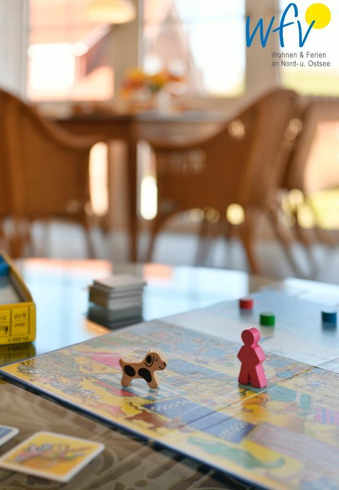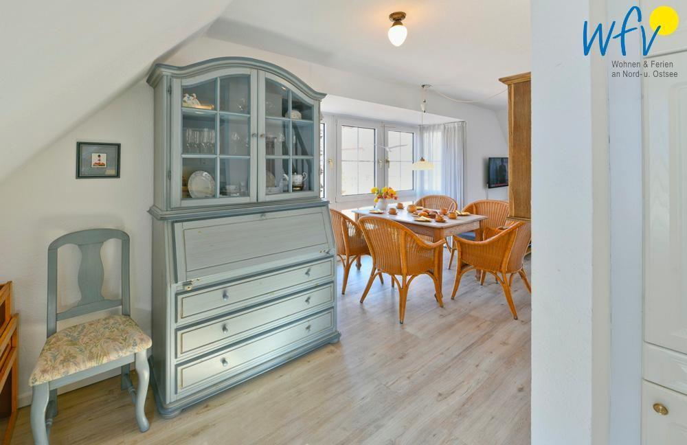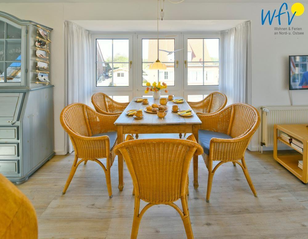 Gemeinsame entspannte Stunden können Sie in dem Wohnraum mit Couchecke und TV verbringen. Die Essgruppe mit schönem Ausblick nach draußen lädt dazu ein, bereits beim Frühstück einen neuen erlebnisreichen Tag auf Juist zu planen.