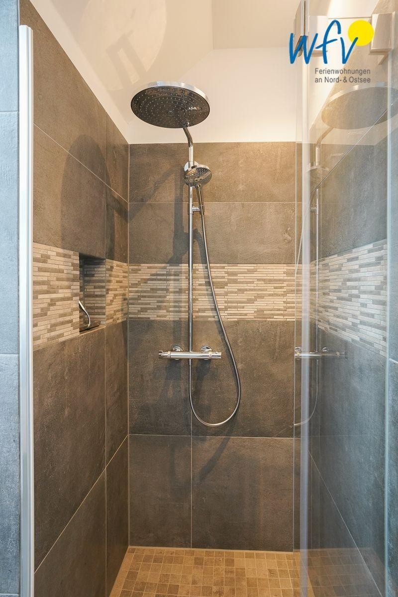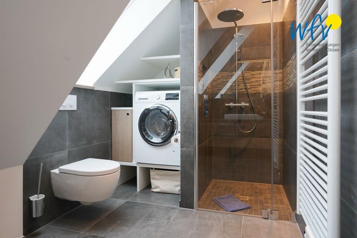 Auch in dem eleganten Badezimmer mit Handtuchheizung und ebenerdiger Dusche erwartet Sie angenehmer Wohnkomfort! Waschmaschine und Trockner können gerne von Ihnen genutzt werden. Ein Fön gehört zum festen Inventar.