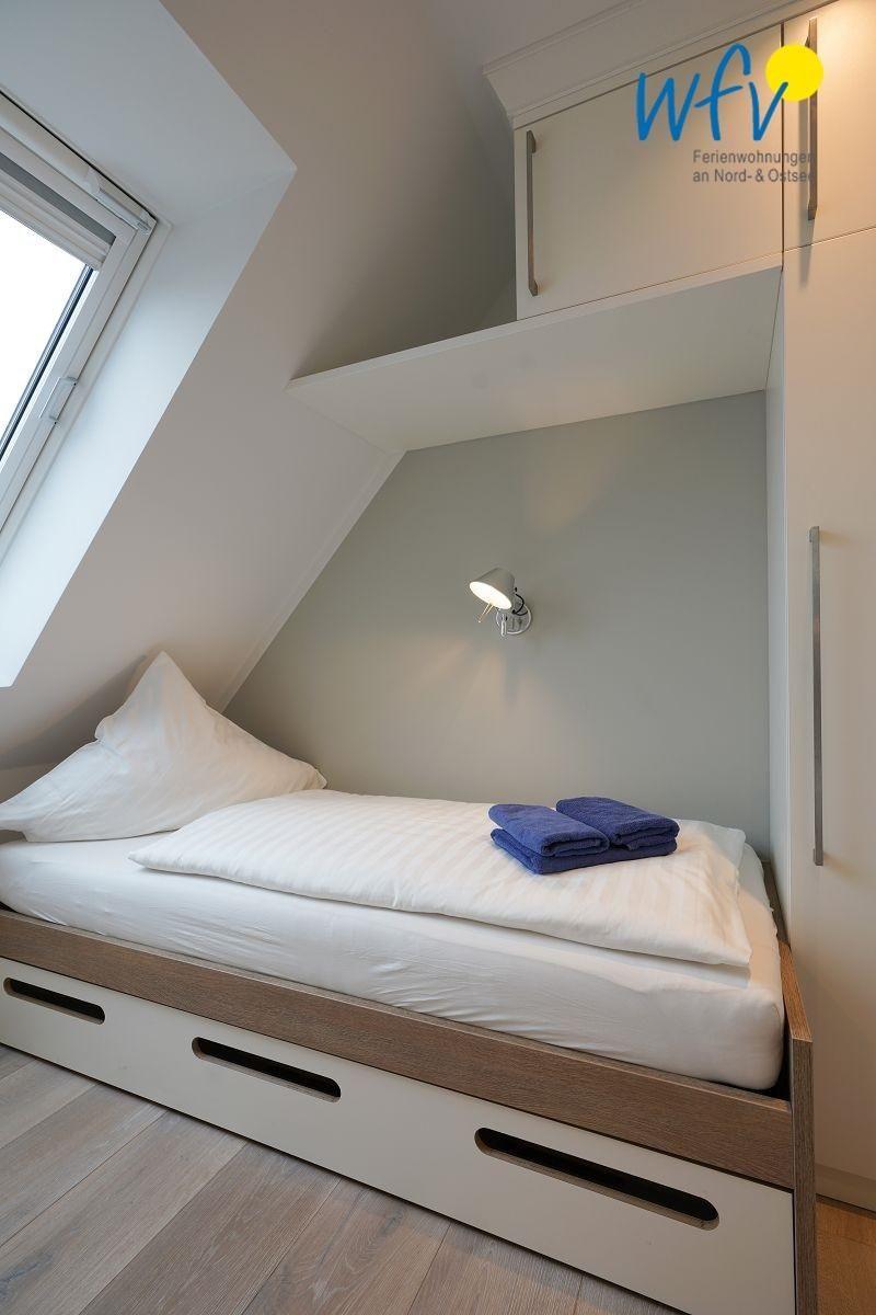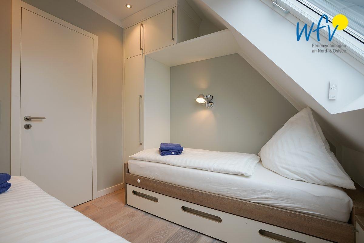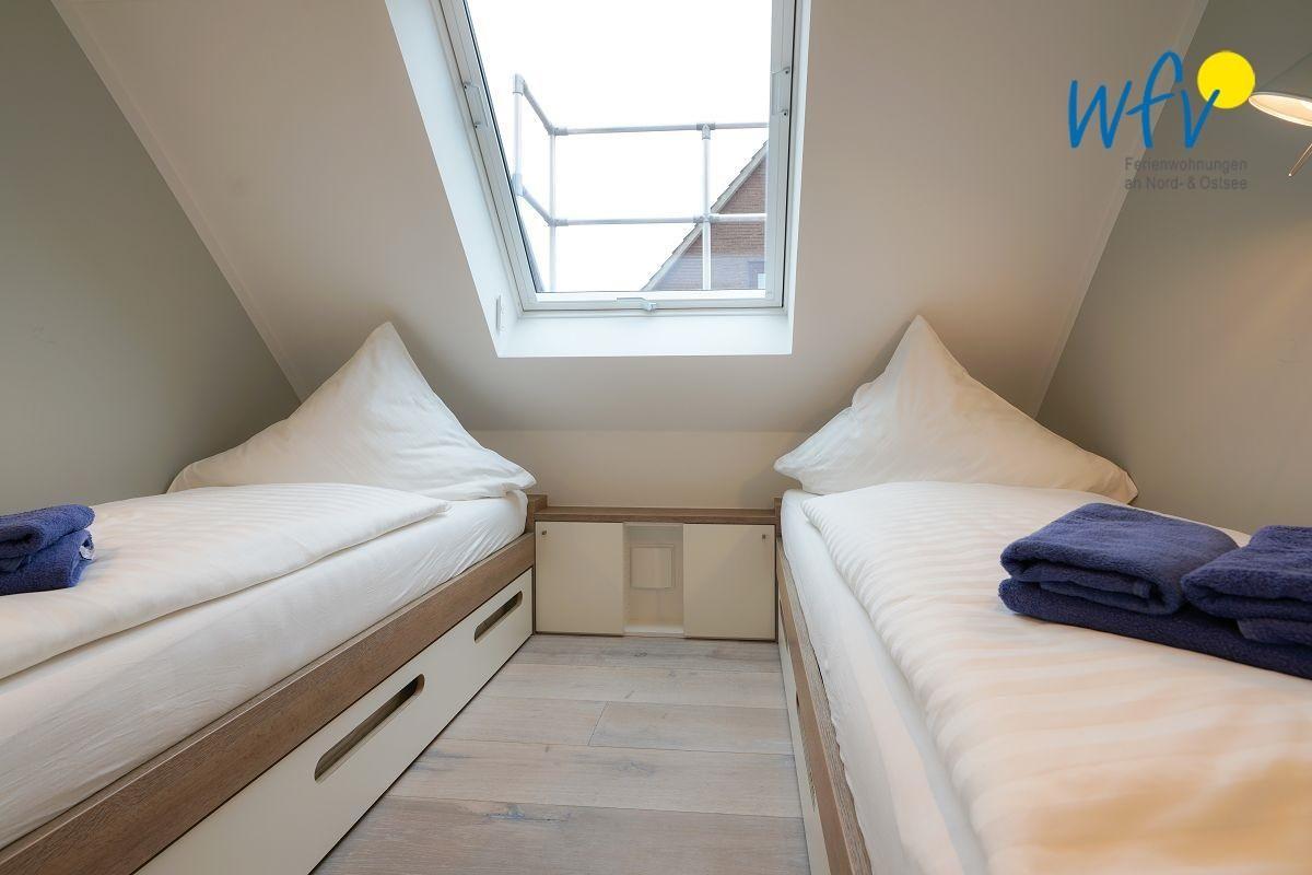 Eines der beiden separaten Schlafzimmer ist mit einem Doppelbett ausgestattet (180 x 200 cm), das andere mit zwei Einzelbetten (je 90 x 200 cm; Ausziehfunktion für ein 3. Kind). Über eine kleine Treppe gelangen Sie ins Dachgeschoss, wo sich eine Galerie mit gemütlicher Doppelalkove für zwei weitere Personen befindet (140 x 200 cm; Achtung, die schmale und steile Leiter ist nur geeignet für Erwachsene und ältere Kinder, s. Fotos - Nutzung auf eigene Gefahr).