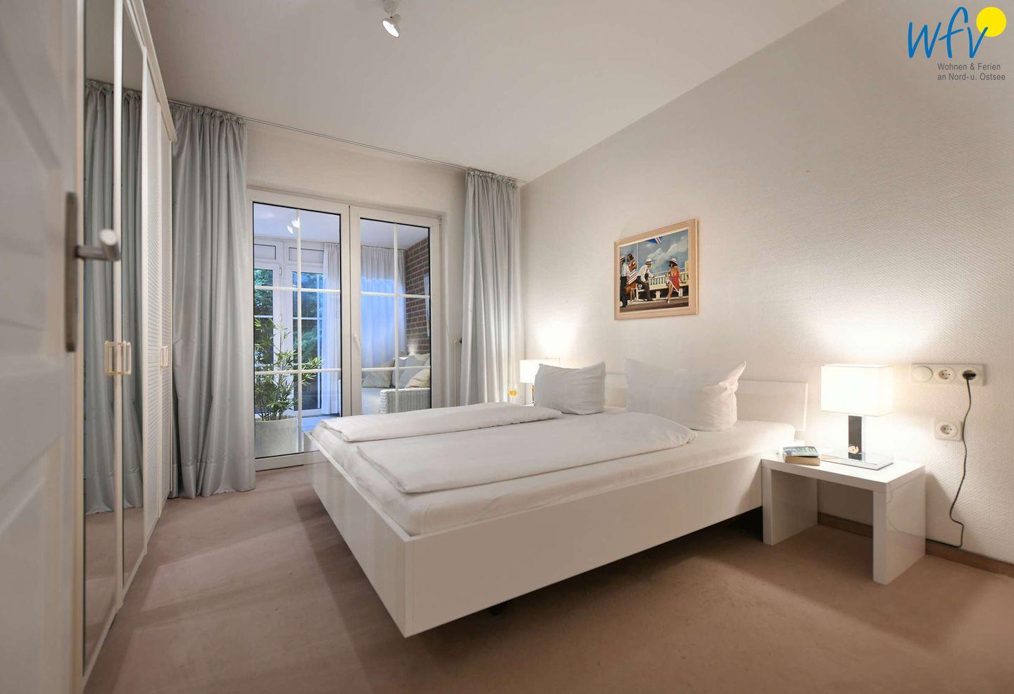 Das separate Schlafzimmer der Ferienwohnung auf Juist ist mit einem Doppelbett (je 90 x 200 cm) ausgestattet. Der Boden wurde mit Teppich verlegt, im Wohnbereich erwartet Sie ein Designboden. Weitere Schlafmöglichkeiten bestehen durch ein Schlafsofa (160 x 200 cm) im Wintergarten und ein Schrankbett (90 x 200 cm) im Wohnzimmer. Zudem gibt es ein Babybett. Alle Schlafplätze haben Verdunklungsmöglichkeiten.