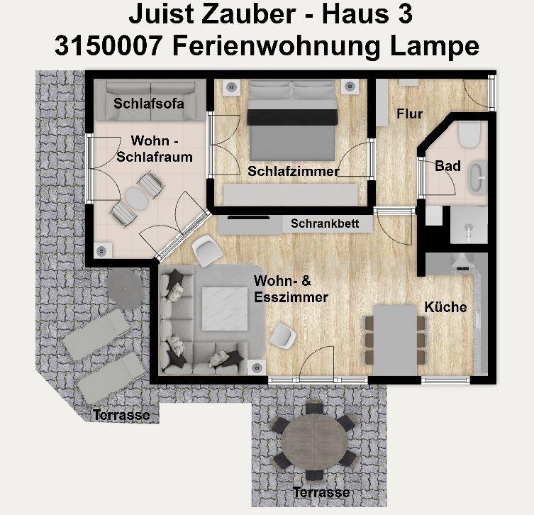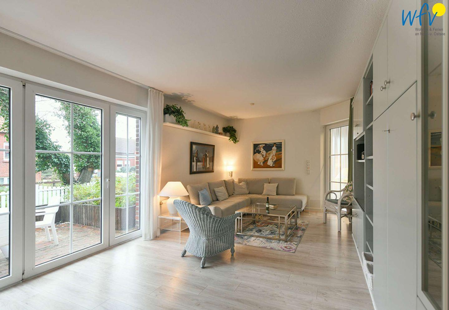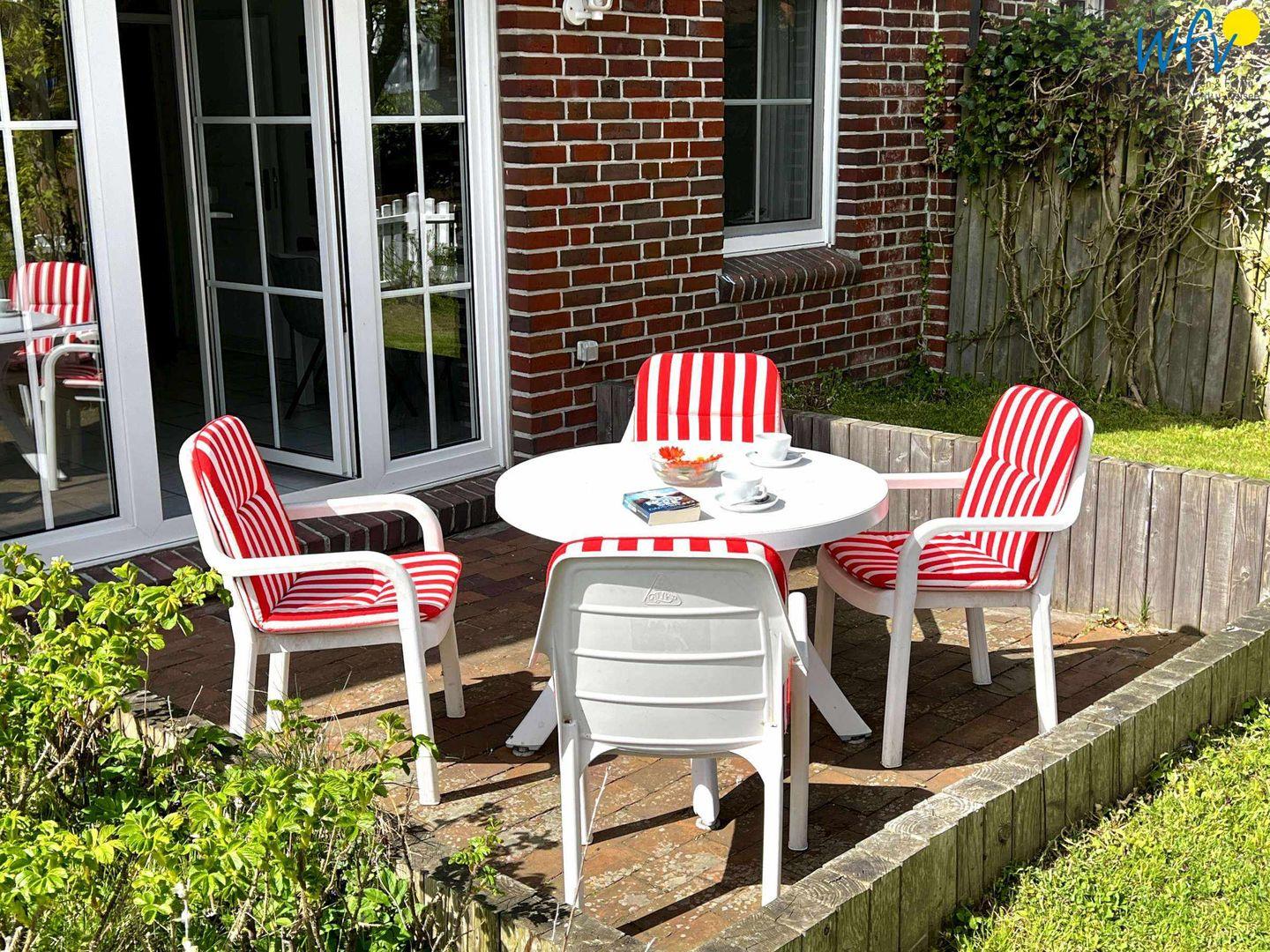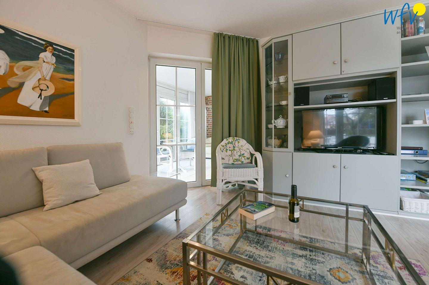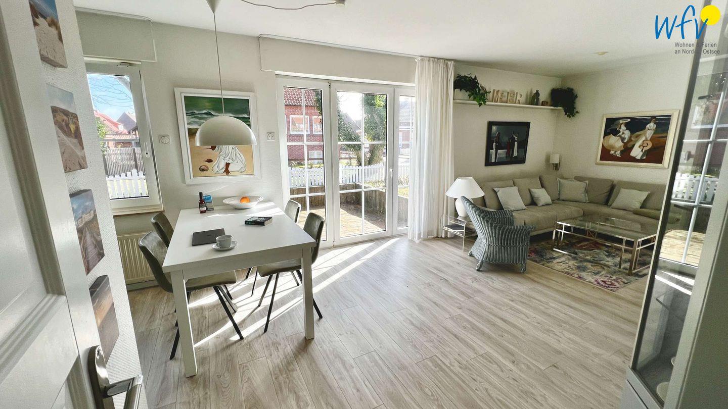 Auf 56 m² Wohnfläche erwartet Sie ein großzügiger Wohnraum mit offener Küche, Esstisch und Couchecke sowie ein separates Schlafzimmer. Außerdem verfügt die Ferienwohnung über einen Wintergarten mit Leseecke und zusätzlicher Schlafcouch sowie über ein Duschbad. Herrlich entspannen können Sie auf der möblierten Sonnenterrasse: Zwei Gartenliegen mit Sonnenschirm und ein Gartentisch mit Stühlen bieten die perfekten Voraussetzungen für erholsame Stunden an der frischen Nordseeluft!