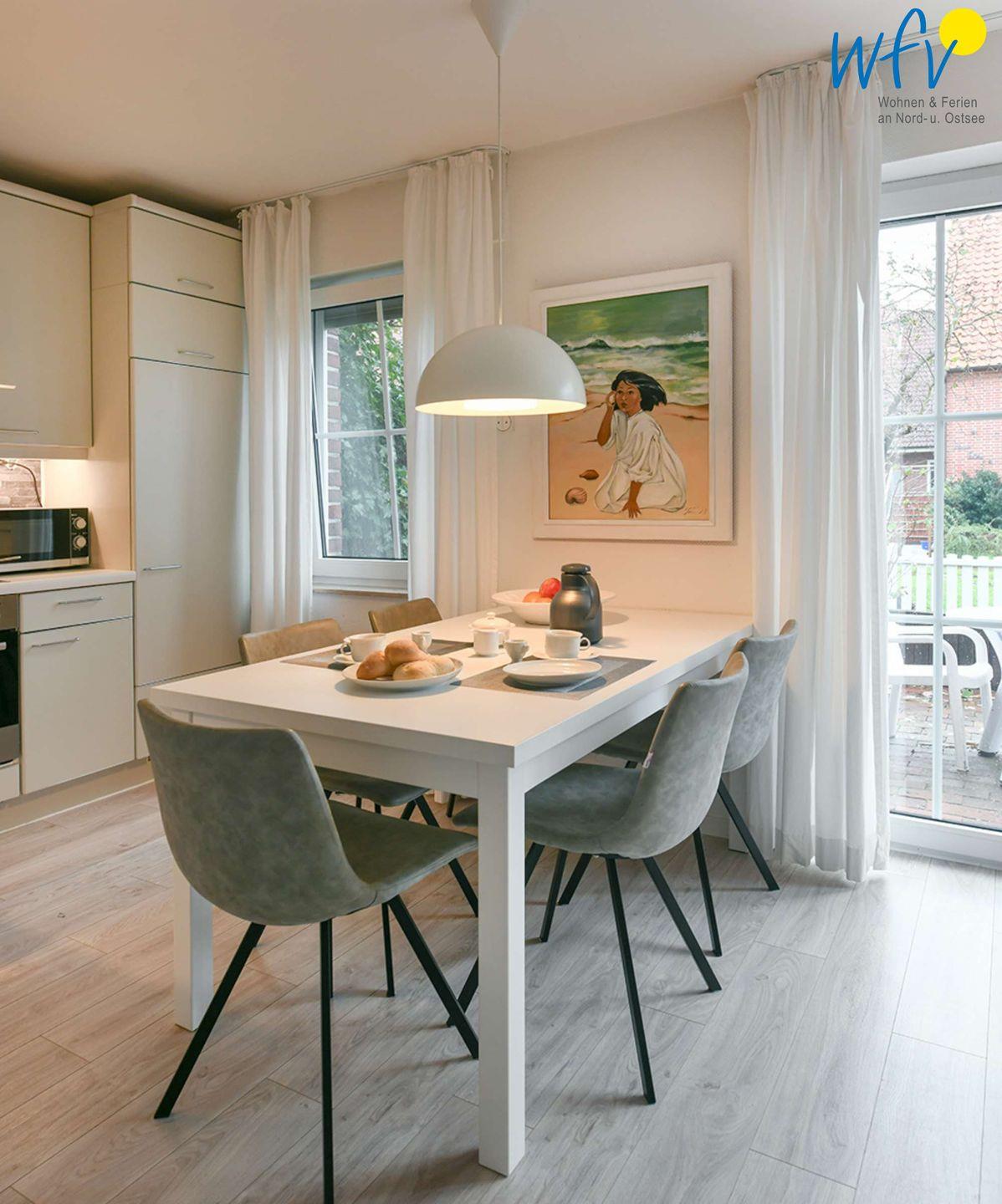 Damit Sie sich in Ihrem Urlaub auf Juist bequem selbst verpflegen können, steht Ihnen eine moderne Einbauküche zur Verfügung - u.a. mit Ceranherd, Backofen, Kühlschrank mit Gefrierfach, Mikrowelle und Spülmaschine sowie Kaffeemaschine, Wasserkocher und Toaster. Auch ein Fonduetopf gehört zum festen Inventar.