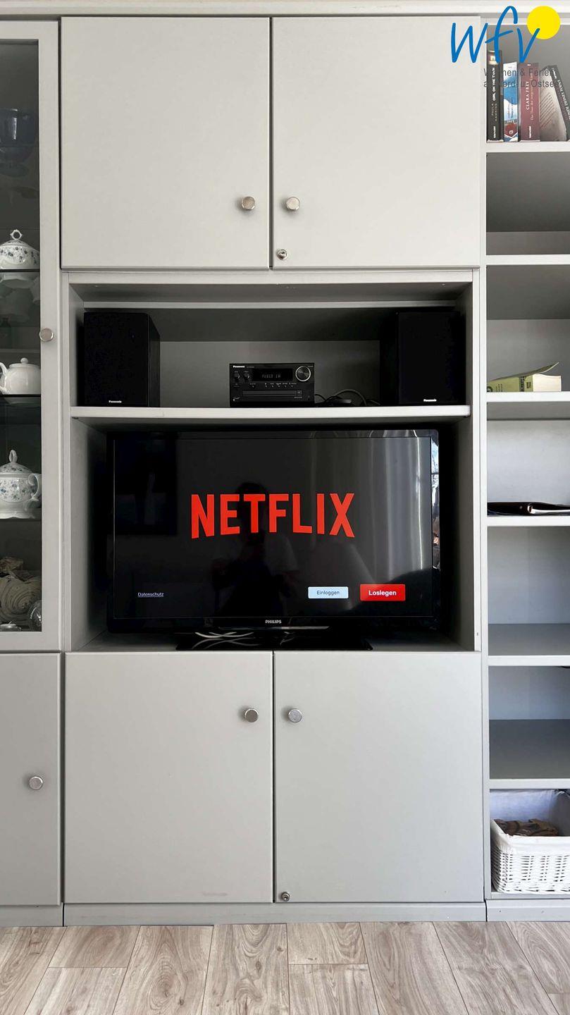 Für die gemeinsame Zeit am Abend ist der Wohnbereich sehr gemütlich mit einer Couchecke und einem Korbsessel eingerichtet. Zudem genießen Sie den Komfort einer hochwertigen technischen Ausstattung - u.a. mit Flachbildfernseher, HiFi-Anlage, freiem WLAN und der Möglichkeit, mit Ihren eigenen Zugangsdaten Filme und Serien über Netflix, Disney+ etc. zu streamen.