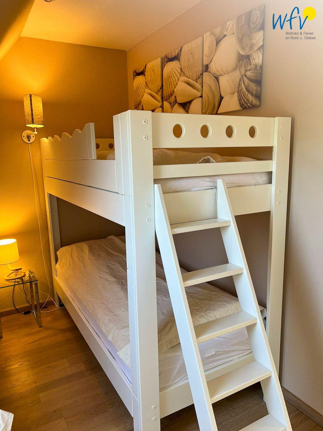 Die Ferienwohnung auf Juist verfügt über zwei separate Schlafzimmer. In dem einen Zimmer befindet sich ein Doppelbett (180 x 200 cm), in dem anderen ein Etagenbett und ein Einzelbett (unter der Dachschräge; Bettenmaße je 90 x 200 cm).