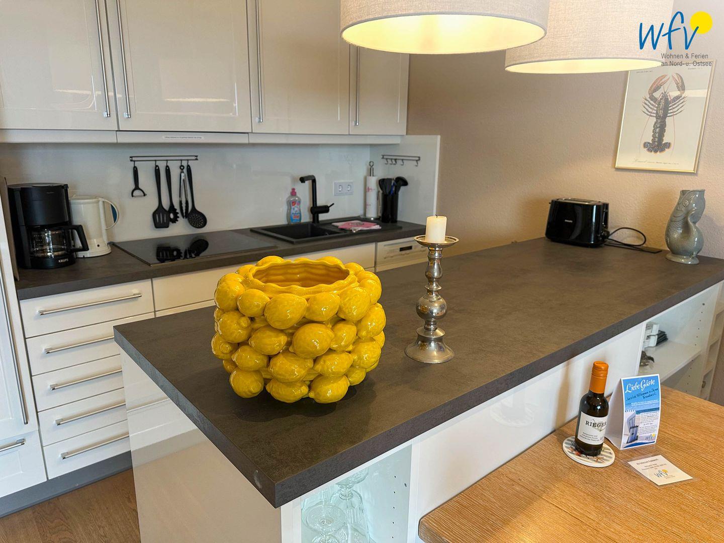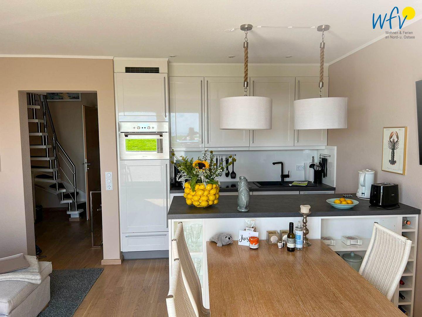 Für eine bequeme Selbstverpflegung ist eine moderne Küche vorhanden – u.a. mit Ceranherd, Backofen, Kühlschrank mit Gefrierfach, Mikrowelle und Geschirrspüler sowie Espressomaschine, Toaster, Mixer und Wasserkocher. Ein sonniger Essplatz lädt zu gemeinsamen Mahlzeiten ein. Hier bekommt man bereits beim Frühstück Lust, einen neuen ereignisreichen Ferientag auf Juist zu planen: mit Fahrradtouren durch die Dünen, Badespaß am Strand oder Ausflügen zu Sehenswürdigkeiten!