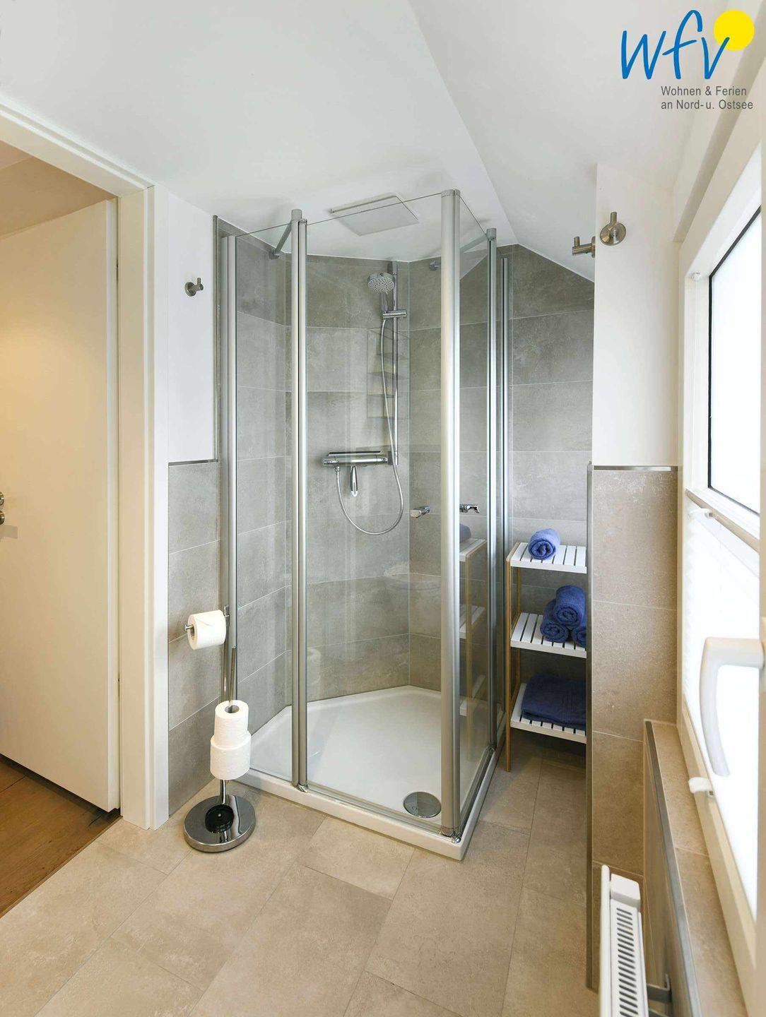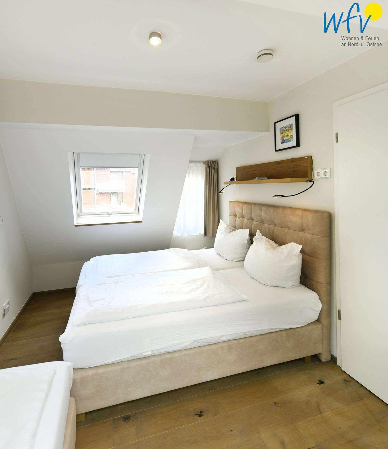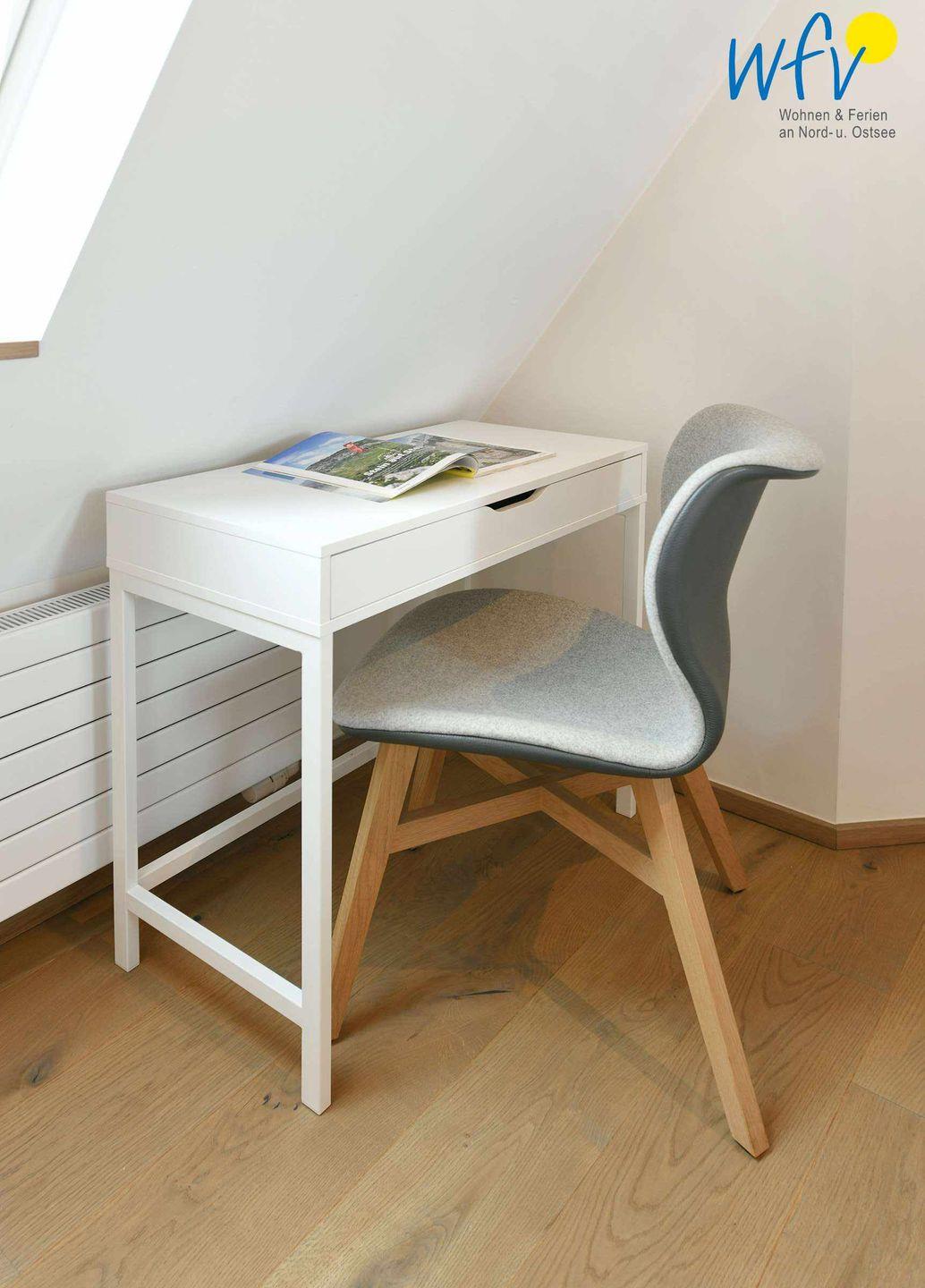 Helle moderne Möbel und ein wunderschöner Lichteinfall durch große Fenster im Wohnbereich und an den Dachschrägen im Schlafzimmer verleihen den Räumen eine sehr freundliche Atmosphäre.