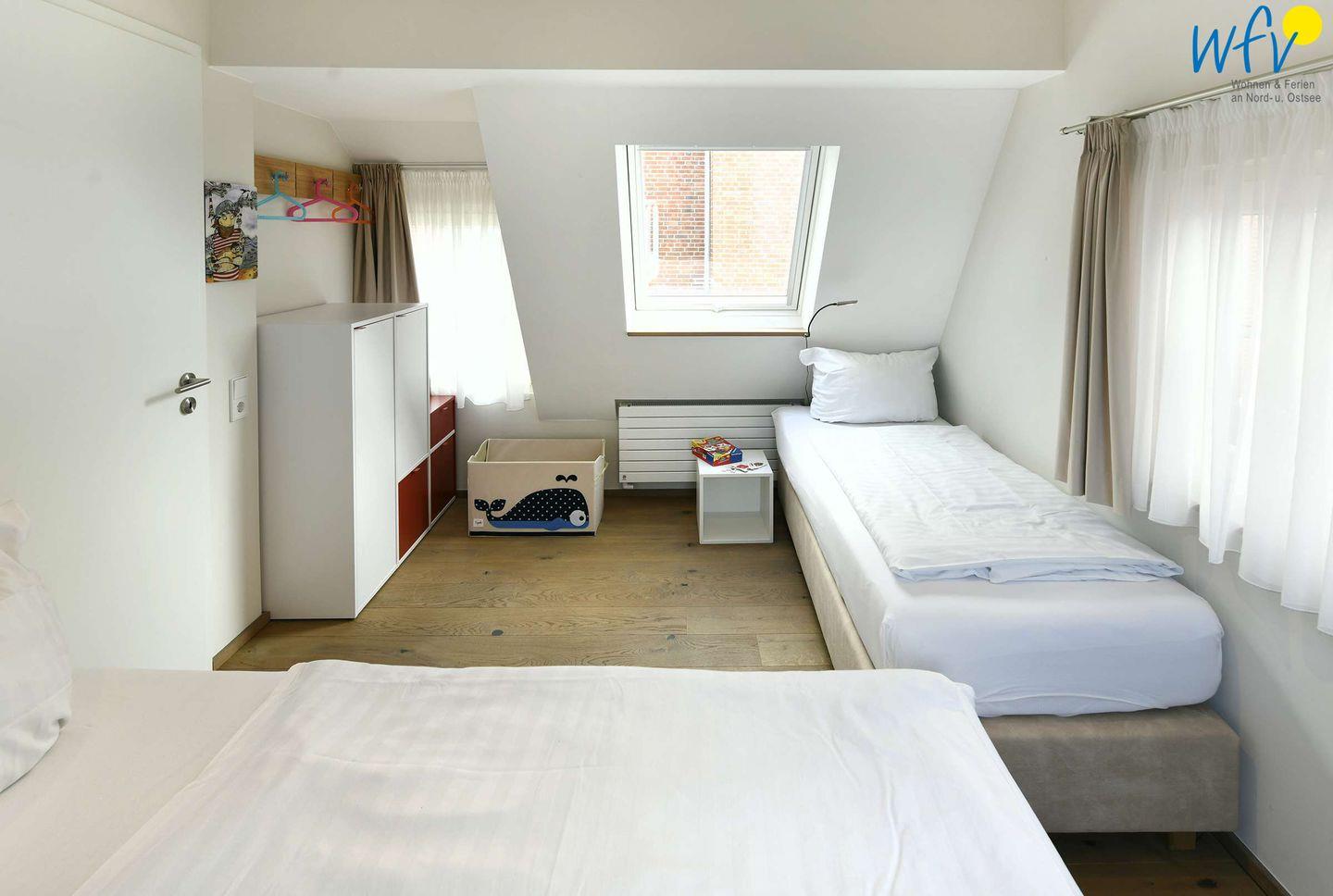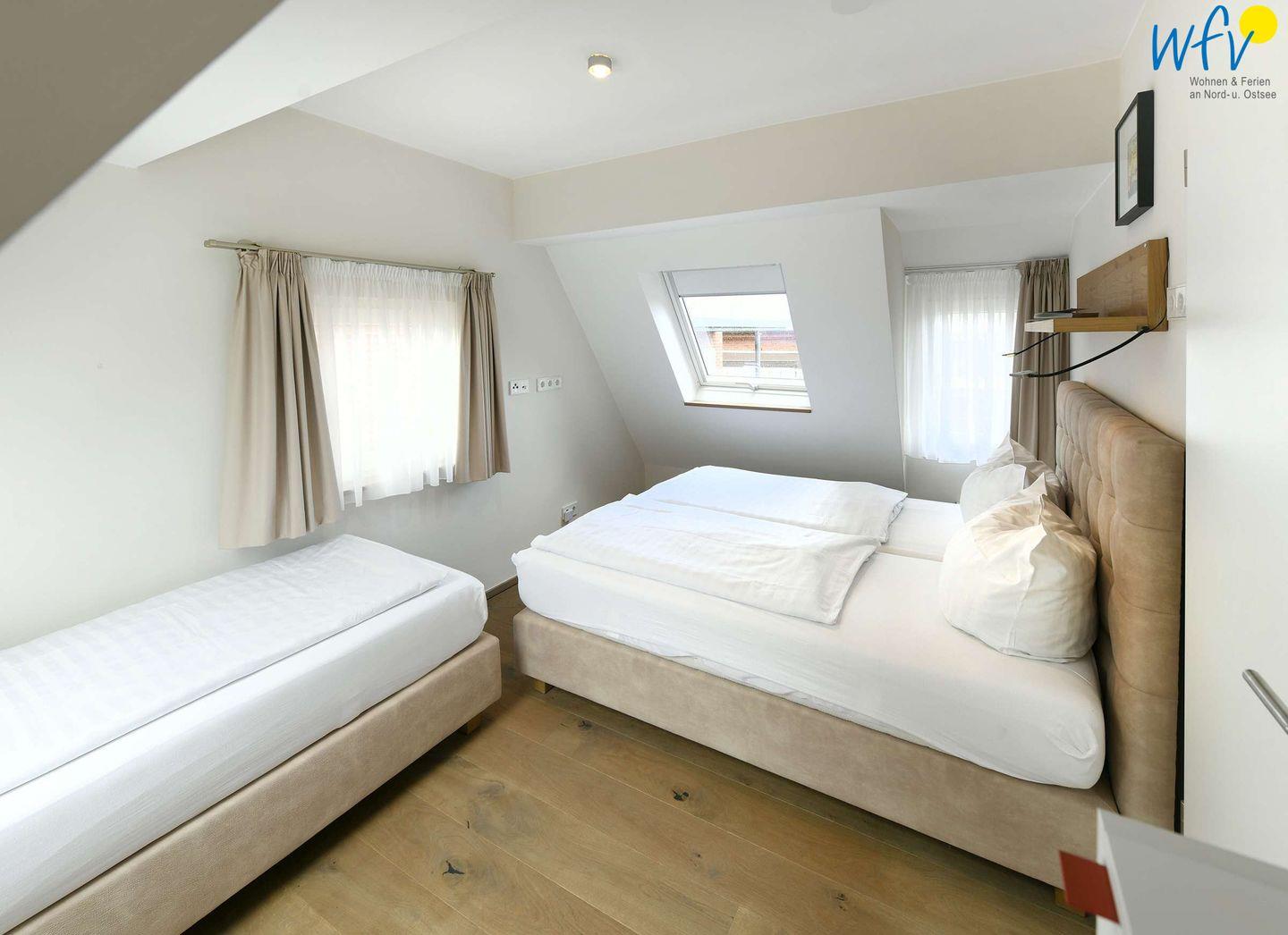 Eines der separaten Schlafzimmer ist mit einem Doppelbett ausgestattet (180 cm x 200 cm), das andere mit einem Doppelbett (160 cm x 200 cm) und einem Einzelbett (80 cm x 200 cm).