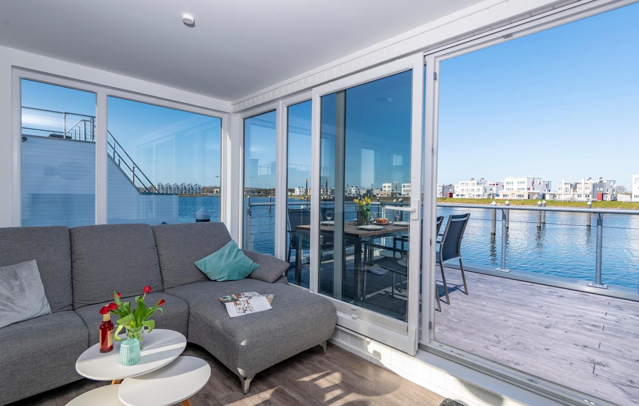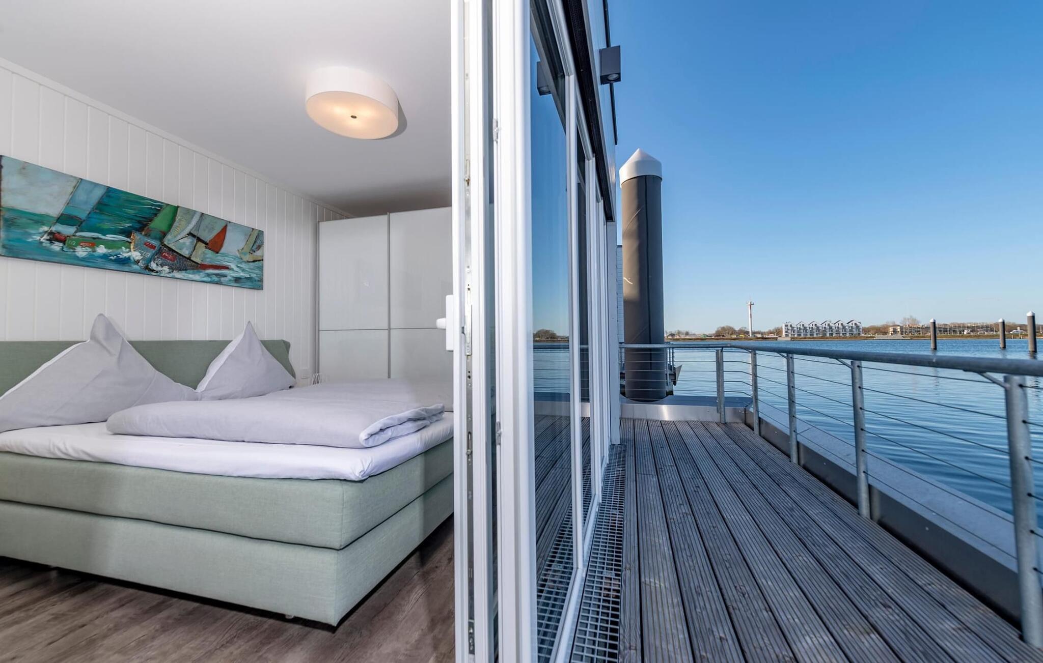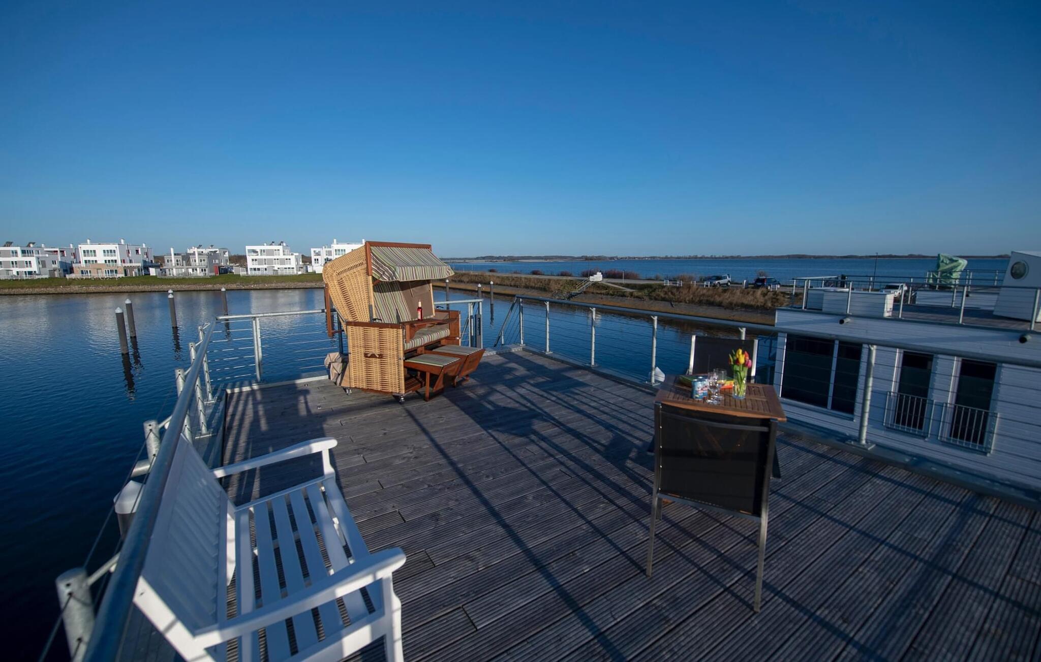 Vand så langt øjet rækker. Det betagende landskab kan nydes gennem gulv-til-loft panoramavinduer, og tagterrassen byder på en spektakulær 360-graders udsigt over Slien, Østersøen og marinaen. Østersøen er kun en badestige væk, og sandstranden i Baltic Sea Resort kan nås til fods. I den mørke årstid giver gulvvarme og sauna hyggelig komfort, da wellness-programmet ombord er et must. For dem med en sød tand har dette flydende hus endda et vaffeljern. Udover havnebiografen sørger HD-tv med hjemmeunderholdningsprogram for underholdning, mens afslapningssofaen kan trækkes ud automatisk. Den fiberoptiske forbindelse med maksimal mulig upload- og downloadkapacitet giver fuld feriekomfort.