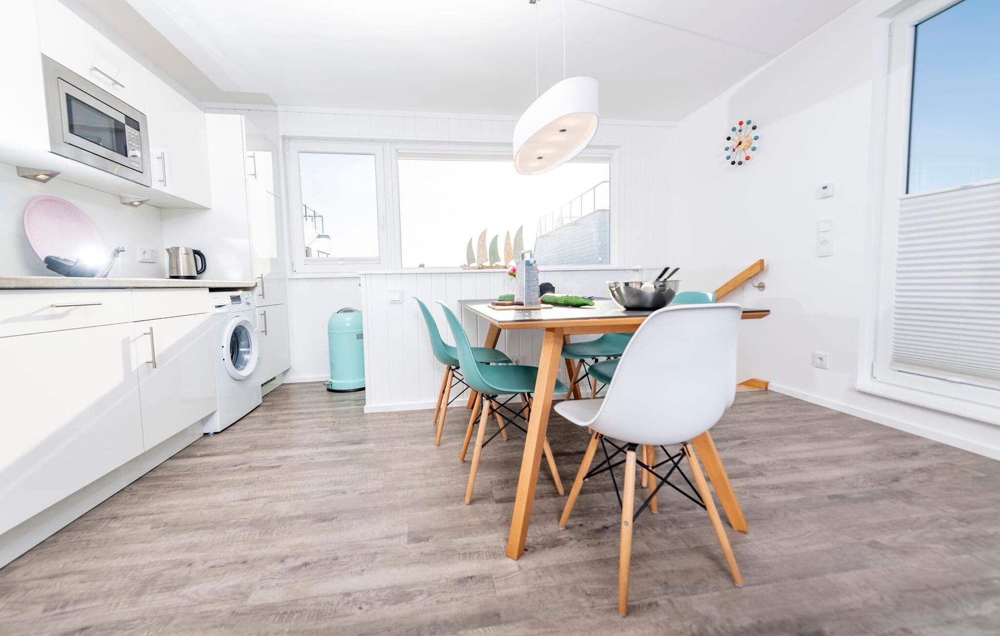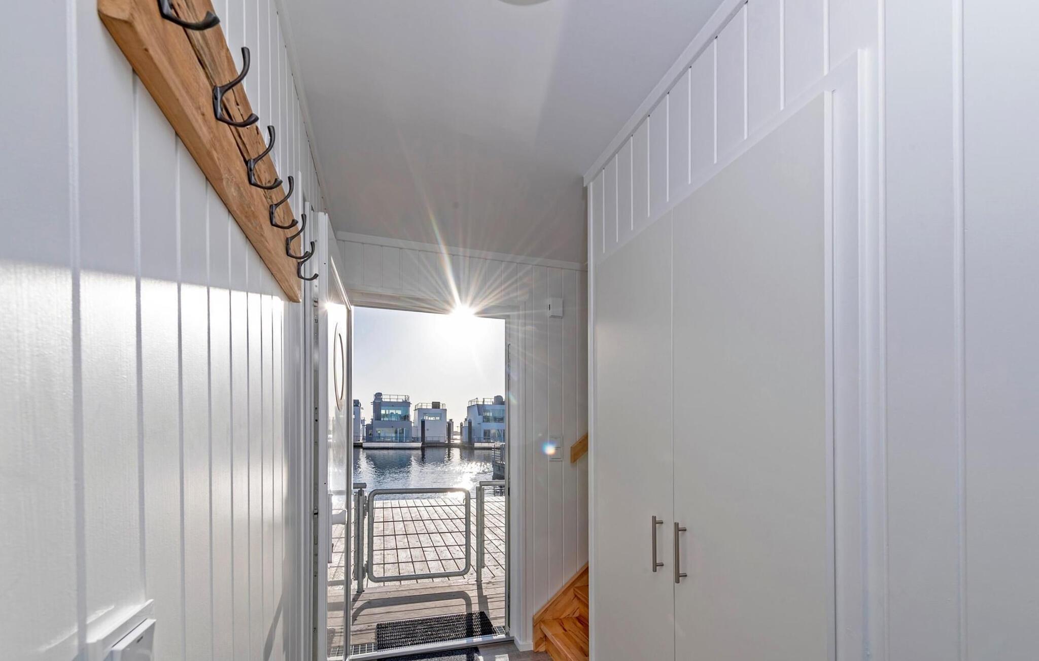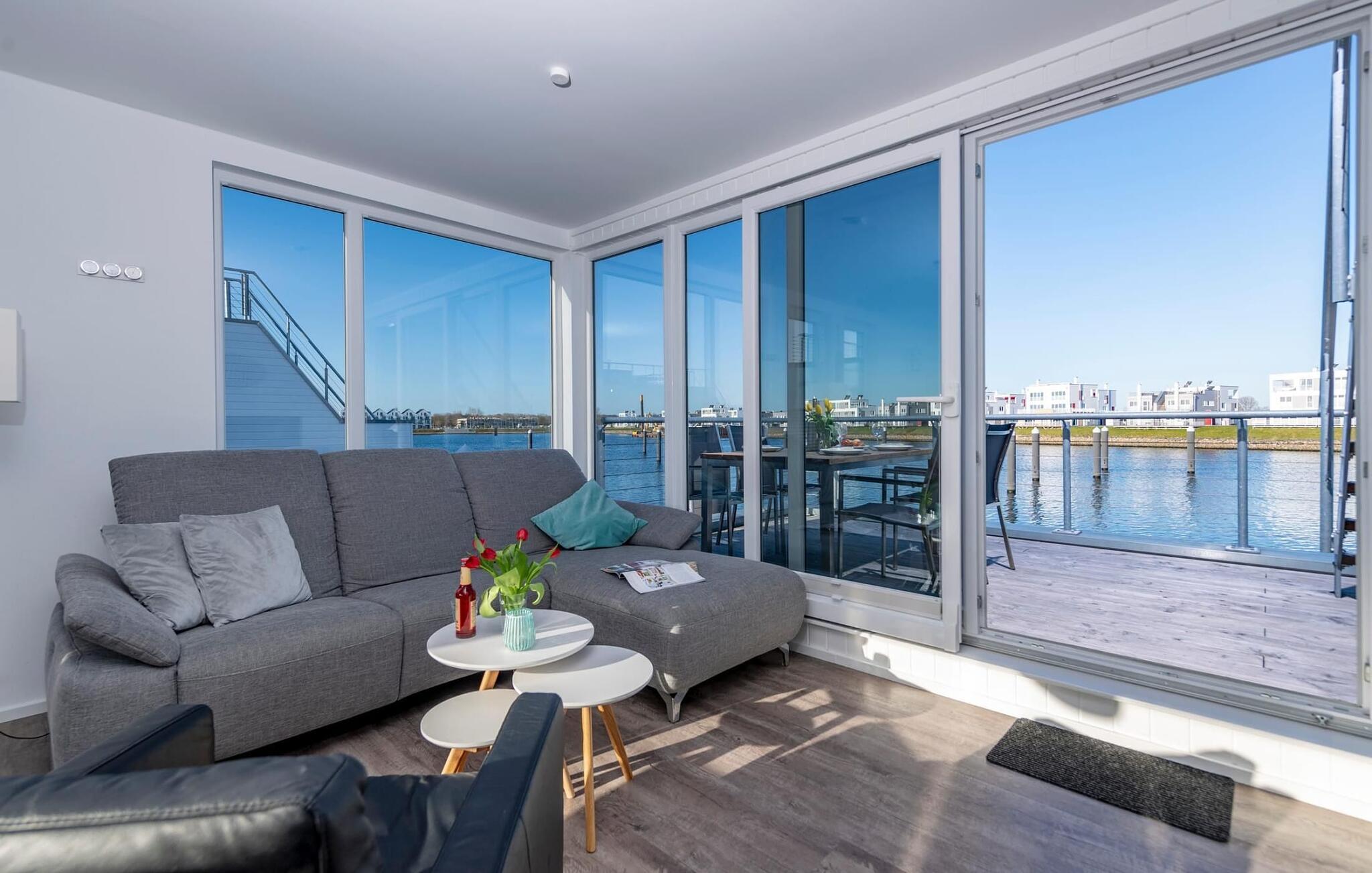 Vand så langt øjet rækker. Det betagende landskab kan nydes gennem gulv-til-loft panoramavinduer, og tagterrassen byder på en spektakulær 360-graders udsigt over Slien, Østersøen og marinaen. Østersøen er kun en badestige væk, og sandstranden i Baltic Sea Resort kan nås til fods. I den mørke årstid giver gulvvarme og sauna hyggelig komfort, da wellness-programmet ombord er et must. For dem med en sød tand har dette flydende hus endda et vaffeljern. Udover havnebiografen sørger HD-tv med hjemmeunderholdningsprogram for underholdning, mens afslapningssofaen kan trækkes ud automatisk. Den fiberoptiske forbindelse med maksimal mulig upload- og downloadkapacitet giver fuld feriekomfort.