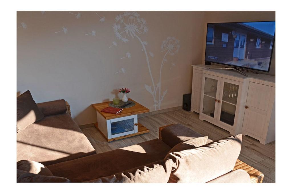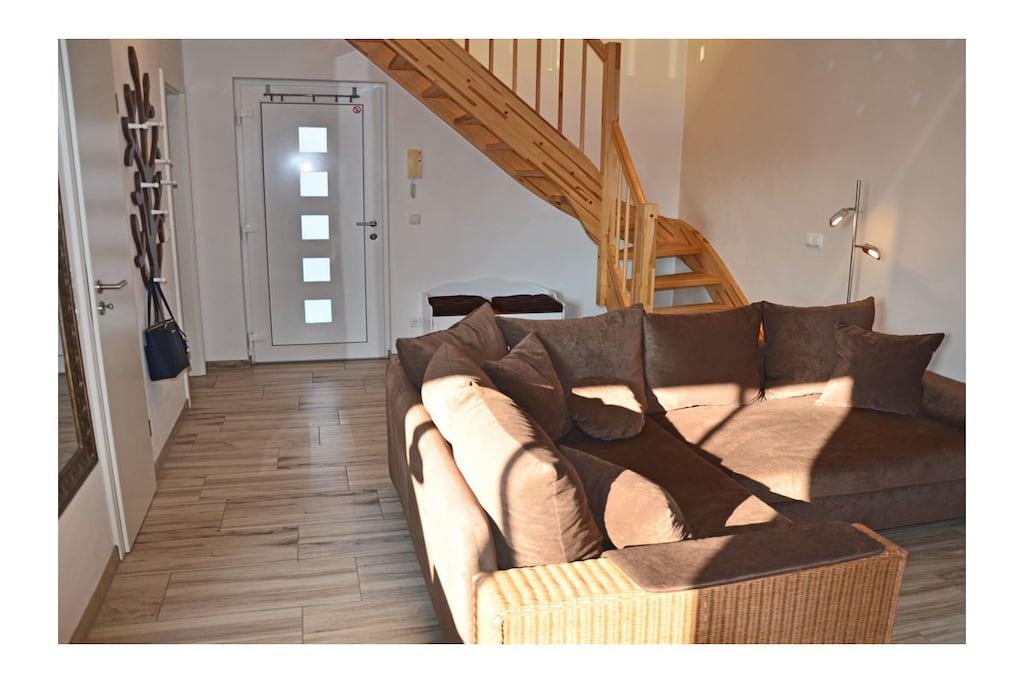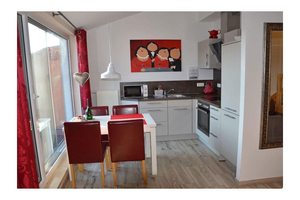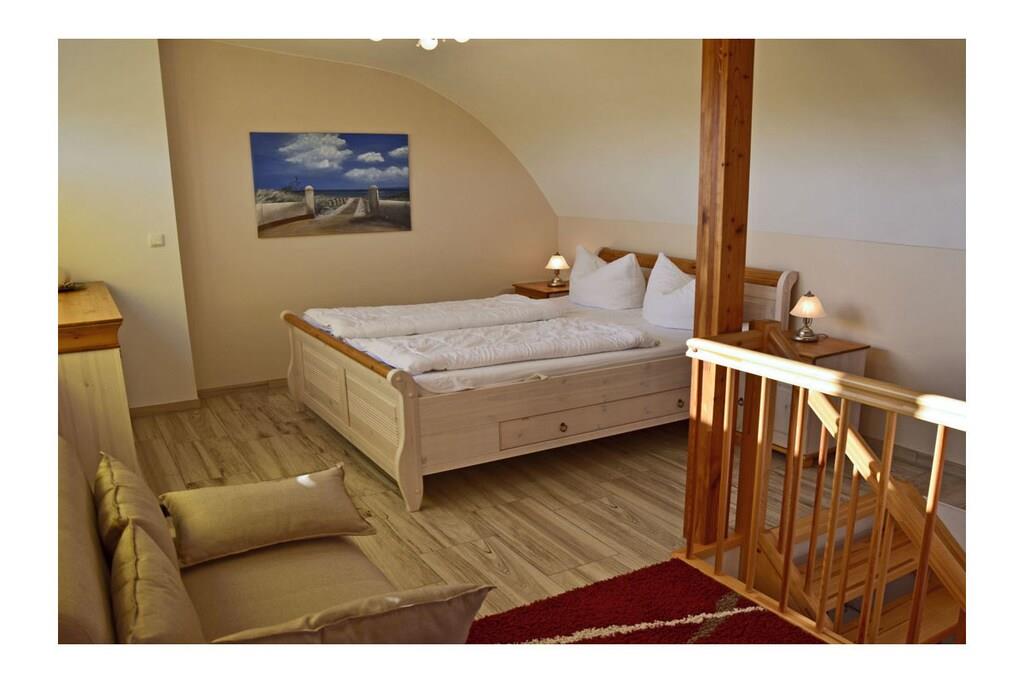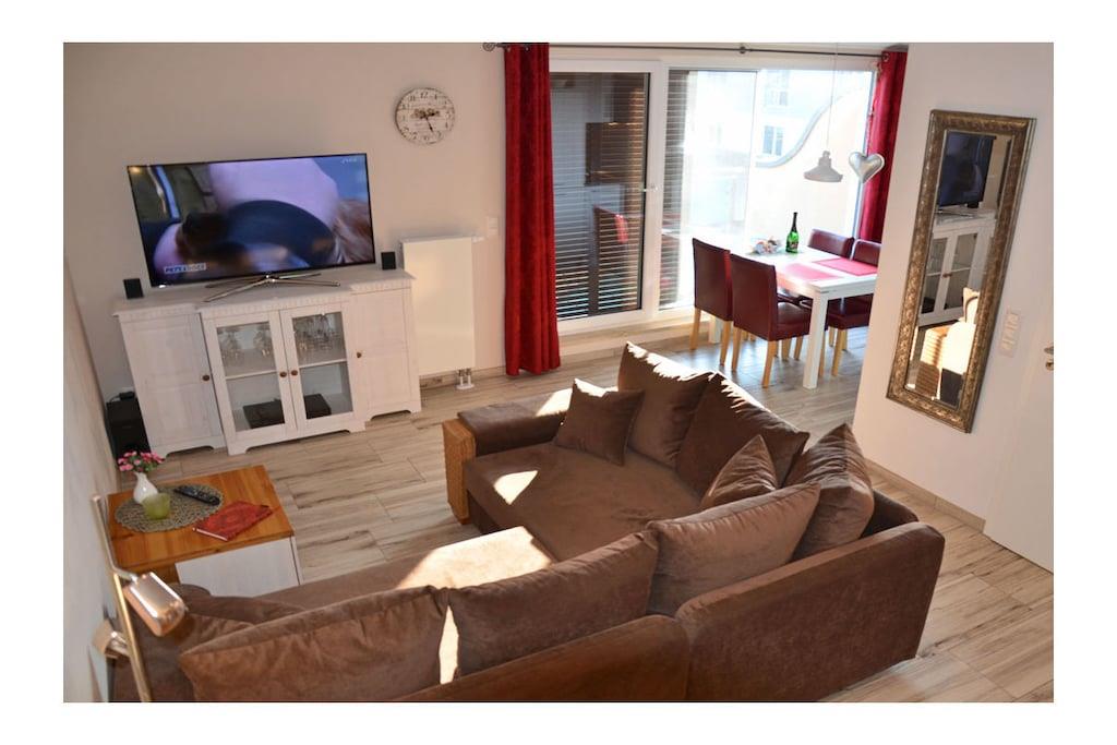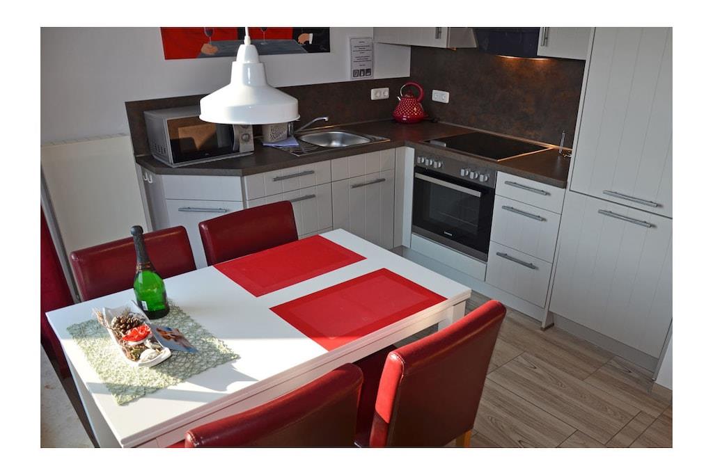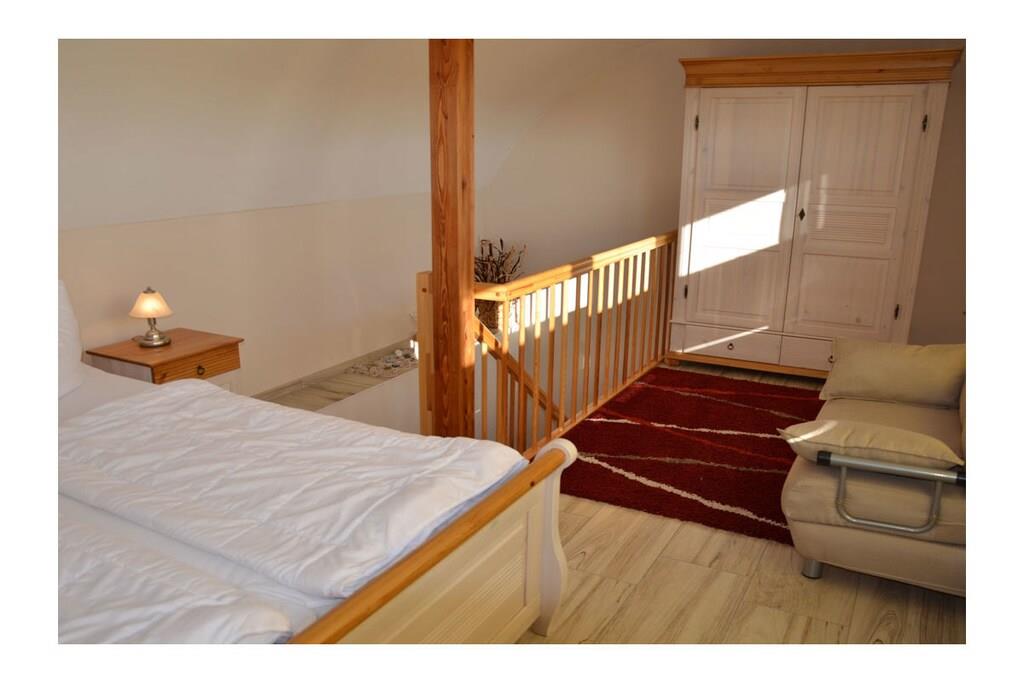 Wohn- Essbereich mit gemütlicher Sofalandschaft, Balkonzugang, TV/ Sat (Flatscreen/Smart-TV), Radio/ CD, Blu-ray Player, kostenfreies WLAN vorhanden, Gesellschaftsspiele für gemütliche Abende, moderne offene komplett ausgestattete Einbauküche mit 4- Plattenherd (Ceranfeld), Backofen, Geschirrspüler, Mikrowelle, Kühlschrank mit kleinem Gefrierfach und diversen Elektrogeräten. Obergeschoss: offenes Schlafzimmer mit Doppelbett (2 Matratzen je 80 x 200), Kleiderschrank und Schlafsessel (Liegefläche: 98 x 190), komfortables Bad mit Dusche/ WC Außenbereich: großer Südbalkon mit Tisch, 4 Gartenstühle, 1 Liegestuhl und Sonnenschirm “Exklusive Ferienwohnung am Ostseestrand“ Erholen Sie sich in der neuen modernen Ferienwohnung im Appartementhaus Bella Casa. Klare Luft und die meisten Sonnenstunden in Deutschland können Sie hier erleben. Die hell durchflutete und perfekt eingerichtete Ferienwohnung bietet Ihnen alles was das Herz begehrt. Durch den in der Galerie befindlichen Schlafbereich (ohne Kindersicherungstür), bietet die Wohnung einen besonderen Charme. Die Ferienwohnung kann mit 2 Personen sowie 1 Kind belegt werden. Sie erreichen die Wohnung barrierefrei vom Tiefgaragenstellplatz komfortabel über den Fahrstuhl. Abstellmöglichkeiten für Fahrräder sind vorhanden. Den Tag können Sie auf dem großen Südbalkon mit Meeresrauschen ausklingen lassen. Die Bella Casa – Mones ist eine Nichtraucherwohnung. Alle Fenster sind mit Fliegenschutzgitter ausgestattet. 1 Haustier ist bei uns willkommen (Gebühr Euro 5,-/ pro Nacht).