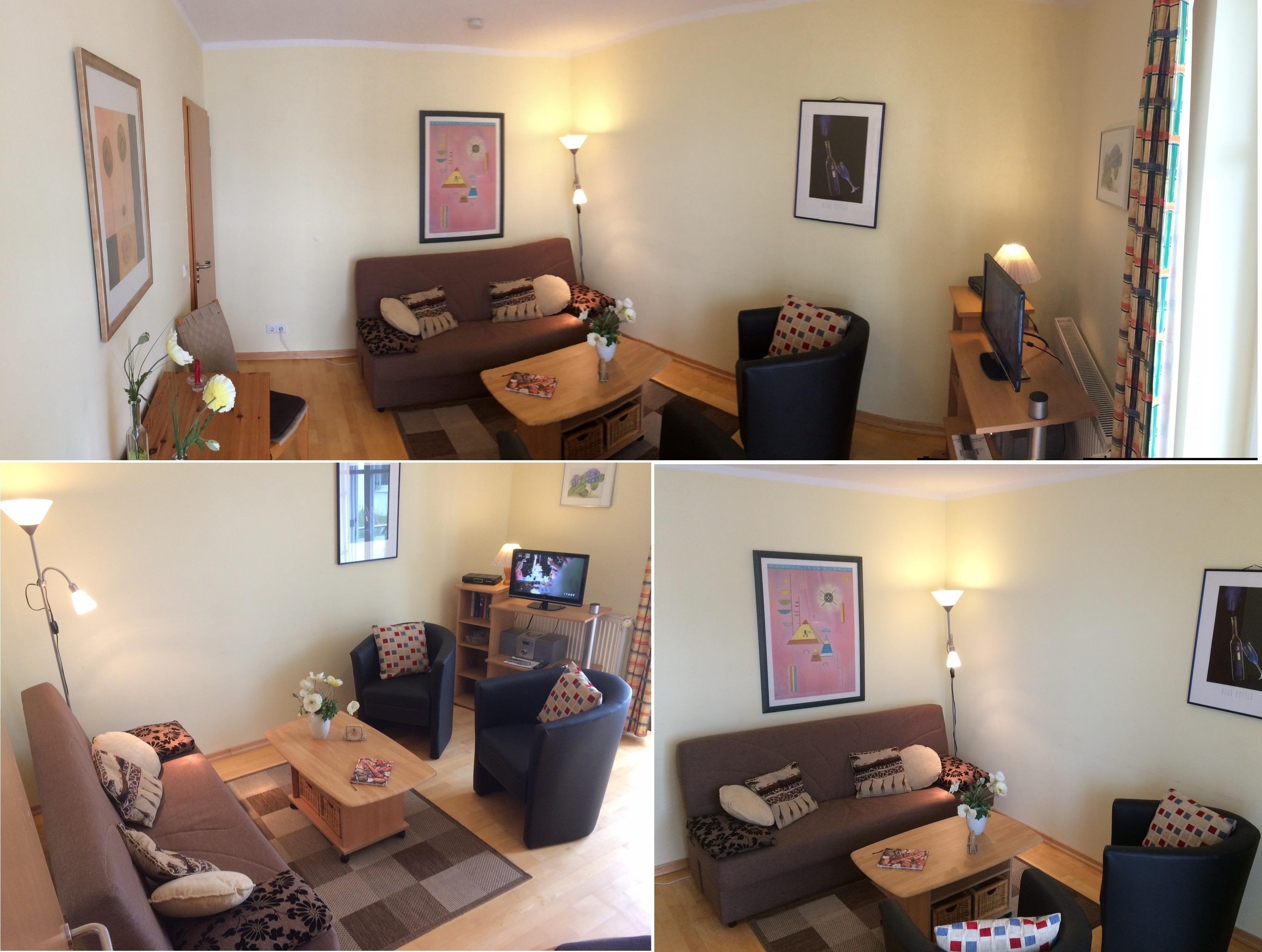 Es stehen Ihnen ein Wohnzimmer mit ausziehbarer Schlafcouch , ein Schlafzimmer mit Doppelbett zur Verfügung. Ein Badezimmer mit Dusche/WC und Spiegelschrank und Fön, sowie eine Kombi Essecke mit Kitchinette und Garderobe.